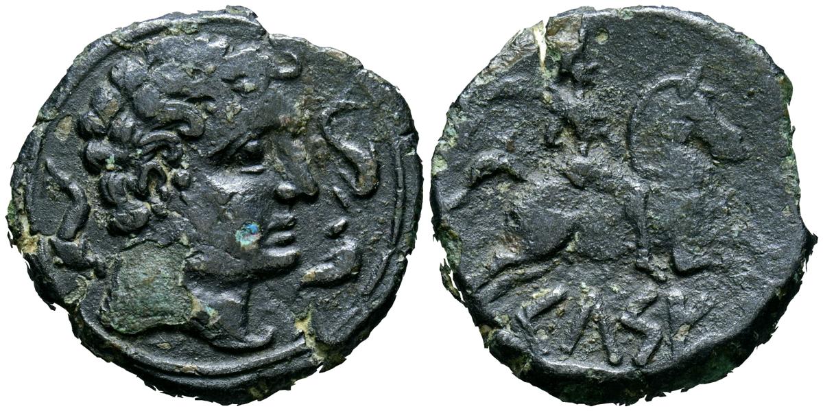 CELSE (Velilla del Ebro, Zaragoza). As. (Ae. 14,29g/28mm). 120-50 a.C. (FAB-771). Anv: Cabeza a derecha con manto y fÃbula a derecha, alrededor tres delfines. Rev: Jinete con palma a derecha, debajo leyenda ibérica sobre lÃnea: CeLSE. MBC.