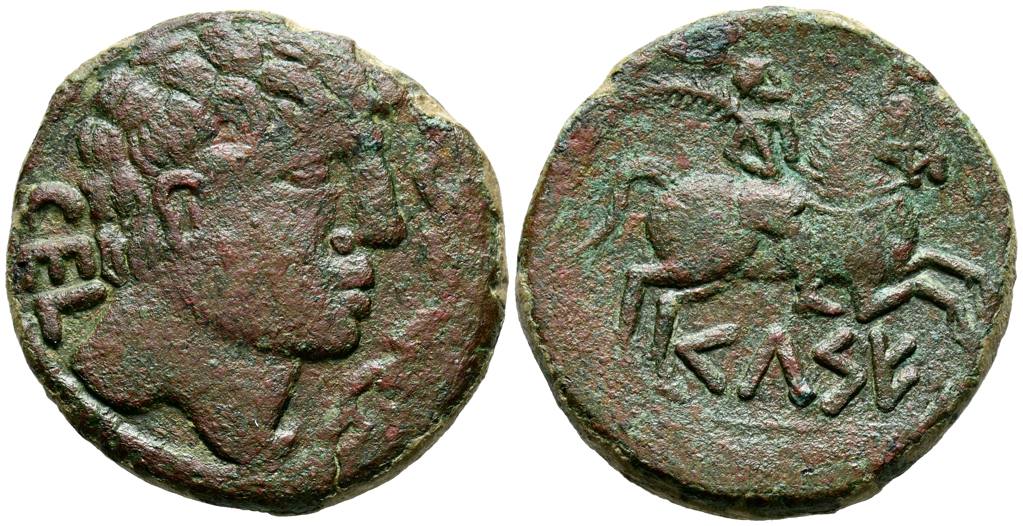 CELSE (Velilla del Ebro, Zaragoza). As. (Ae. 15,55g/31mm). 120-50 a.C. (FAB-773). Anv: Cabeza a derecha con manto y fÃbula a derecha, alrededor tres delfines. Rev: Jinete con palma a derecha, debajo leyenda ibérica sobre lÃnea: CeLSE. MBC.
