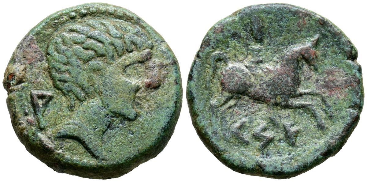 CESE (Tarragona). As. (Ae. 9,17g/24mm). 120-20 a.C. (FAB-2287). Anv: Cabeza masculina a derecha, detrás letra ibérica A. Rev: Jinete con palma a derecha, debajo leyenda ibérica: CeSE. MBC/MBC-.