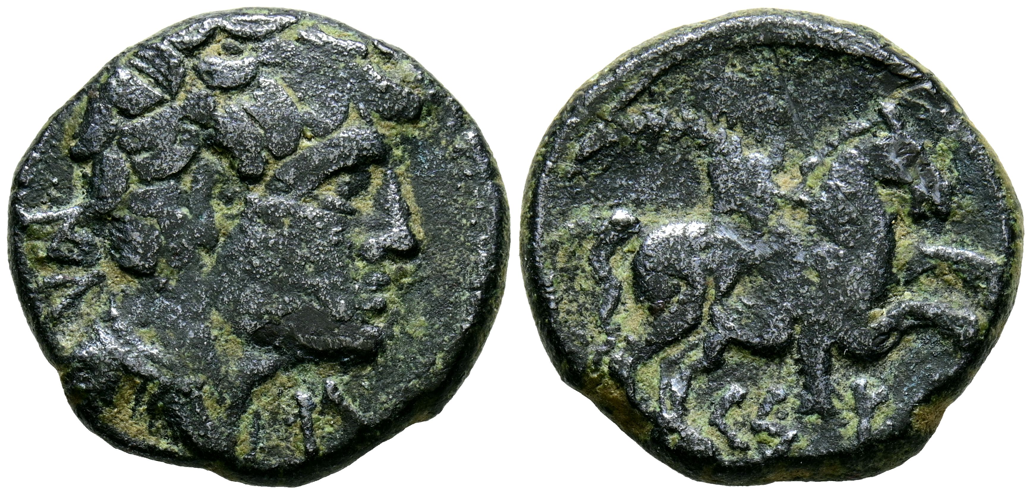 CESE (Tarragona). As. (Ae. 9,52g/24mm). 120-20 a.C. (FAB-2295). Anv: Cabeza masculina a derecha, detrás letras ibéricas: IL, delante S. Rev: Jinete con palma a derecha, debajo leyenda ibérica: CeSE. MBC-.