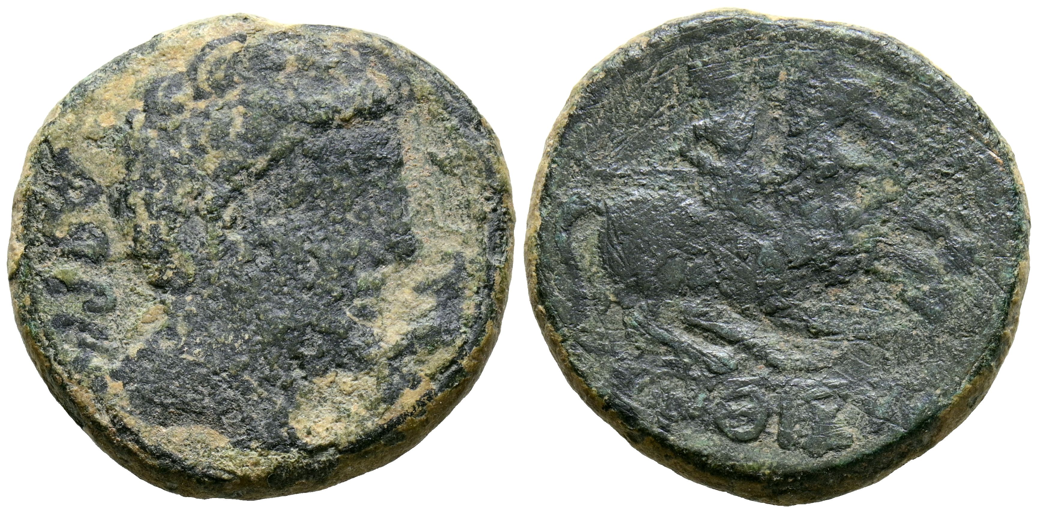 CONTERBIA CARBICA (Huete, Cuenca). As. (Ae. 9,75g/24mm). 120-80 a.C. (FAB-846). Anv: Cabeza masculina a derecha, detrás leyenda: CaRBiCa, delante delfÃn. Rev: Jinete con lanza a derecha, debajo leyenda ibérica bajo lÃnea: CoNTeBaCoM. BC+.