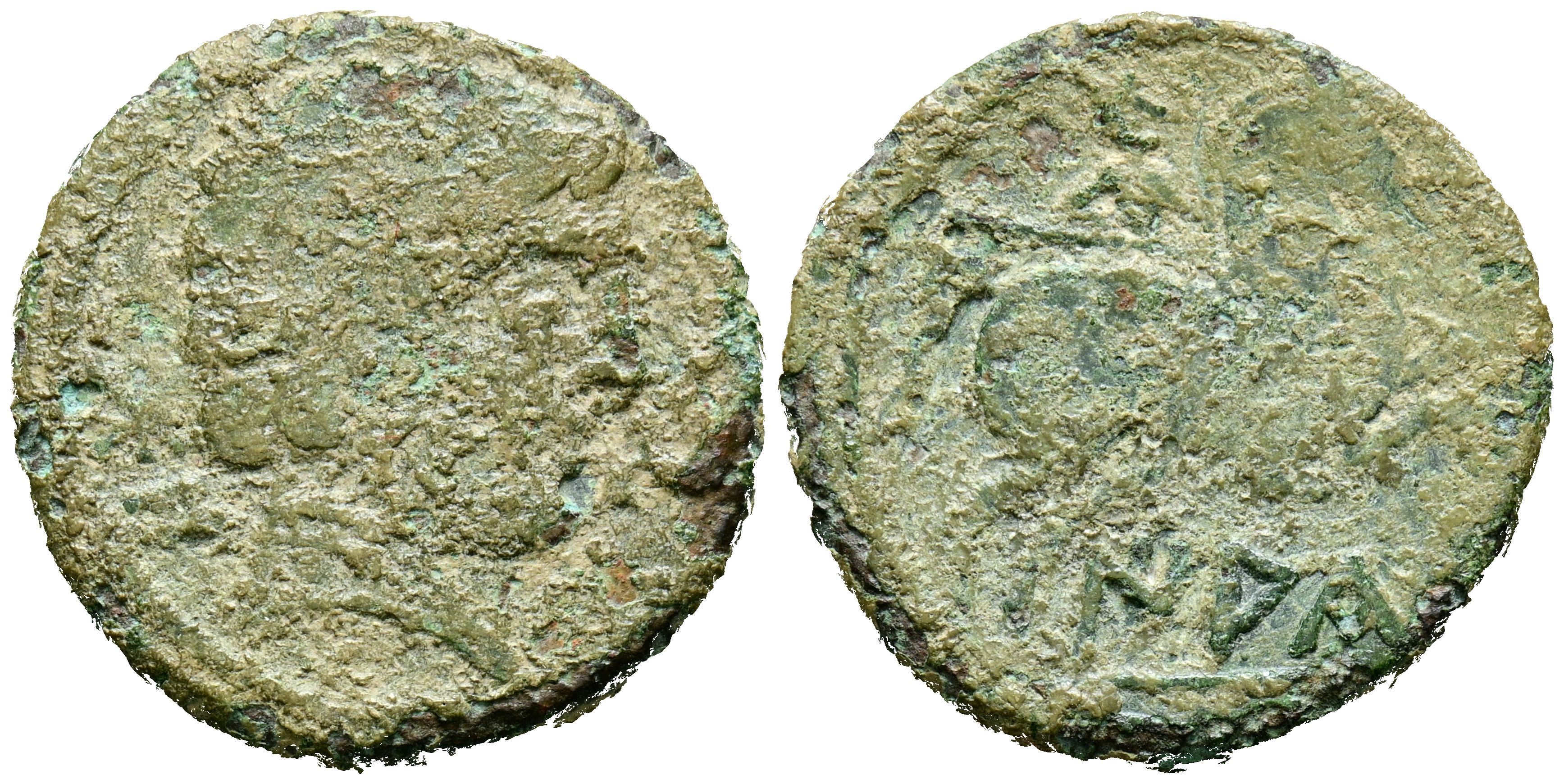 IACA (Jaca, Huesca). As. (Ae. 9,58g/25mm). 120-20 a.C. (FAB-1394). Anv: Cabeza masculina a derecha, detrás letras ibéricas: BoN, delante delfÃn. Rev: Jinete con lanza a derecha, debajo leyenda ibérica sobre lÃnea: IACa. MBC-.