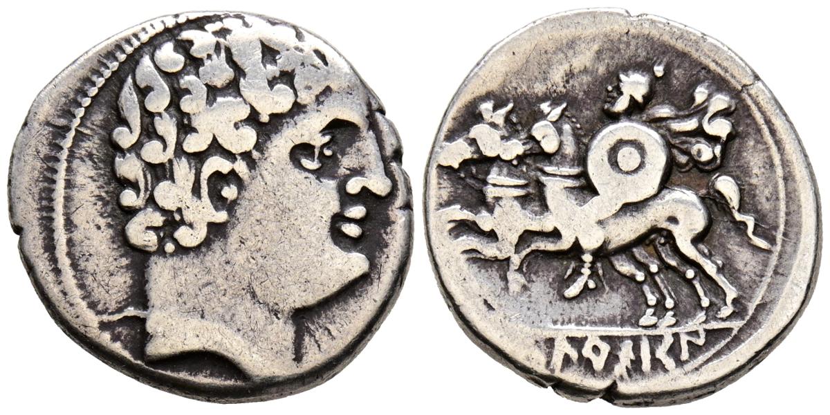 ICALCUSCEN (Iniesta, Cuenca). Denario. (Ar. 3,88g/19mm). 120-20 a.C (FAB-1396). Anv: Cabeza masculina a derecha. Rev: Jinete con dos caballos a izquierda portando escudo y clámide, en exergo leyenda ibérica: ICaLCuSCeN. MBC.
