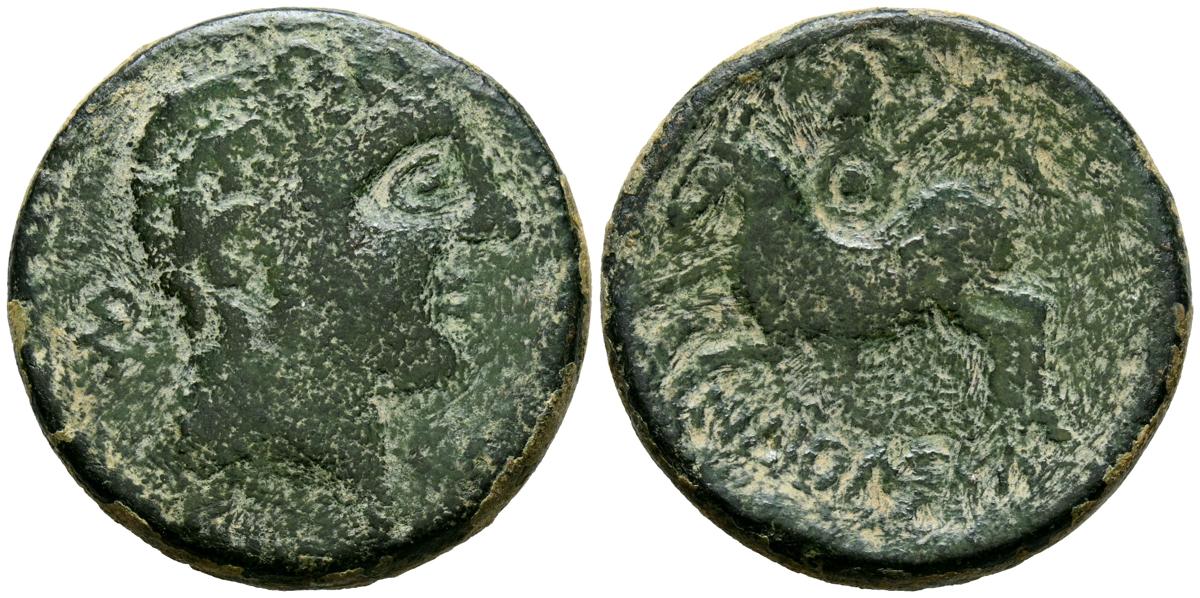 ICALCUNSCEN (Iniesta, Cuenca). As. (Ae. 13,28g/28mm). 120-20 a.C. (FAB-1418 var). Anv: Cabeza masculina a derecha, detrás: CNF, delante: Q. Rev: Jinete con lanza y escudo, debajo leyenda ibérica: ICaLCuNSCeN. BC. Escaso ejemplar.