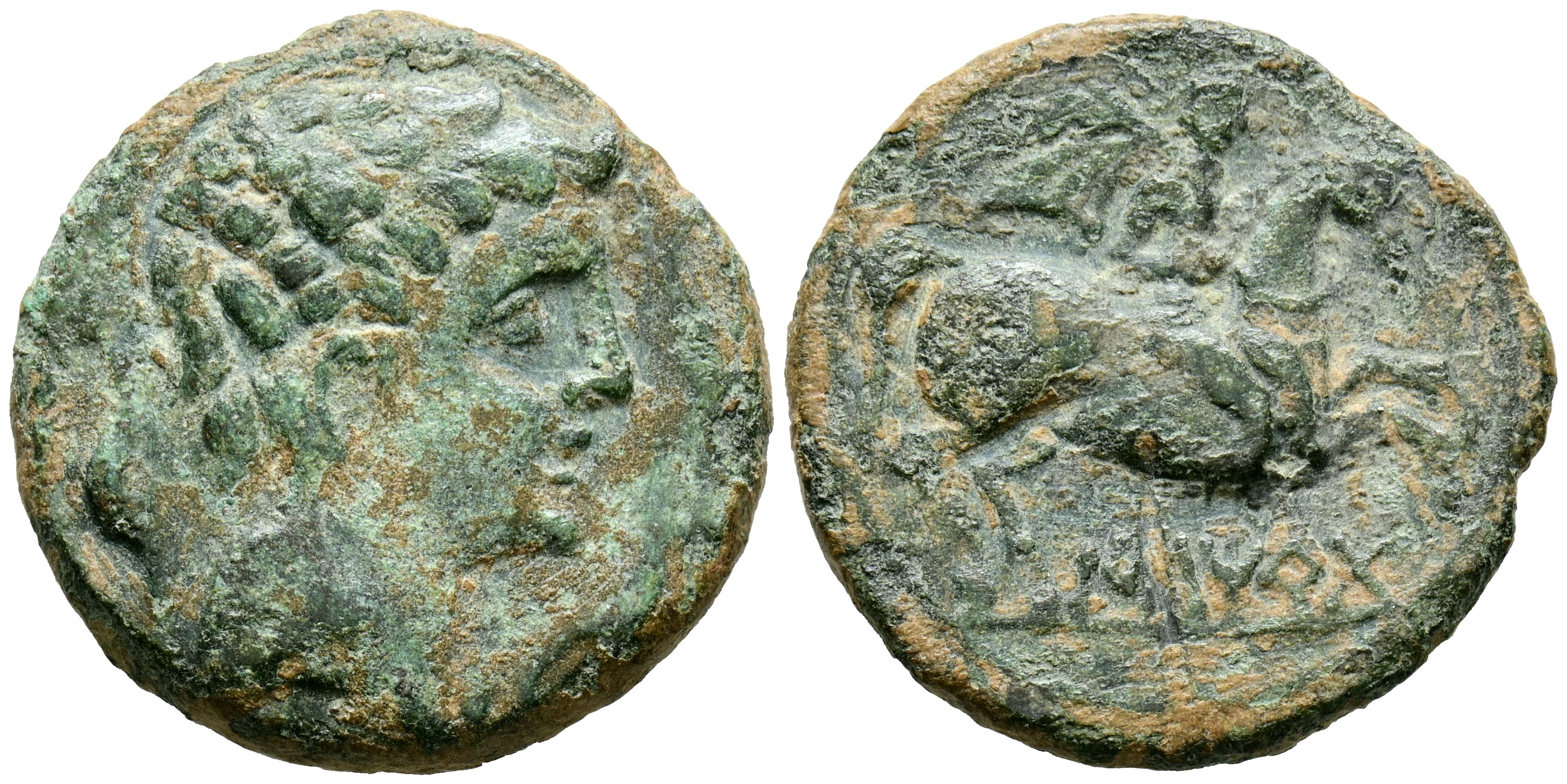 ILTIRTA (Lérida). As. (Ae. 10,94g/26mm). 200-20 a.C. (FAB-1465). Anv: Cabeza masculina a derecha, alrededor tres delfines. Rev: Jinete con palma a derecha, debajo leyenda ibérica: ILTiRTa. MBC-.