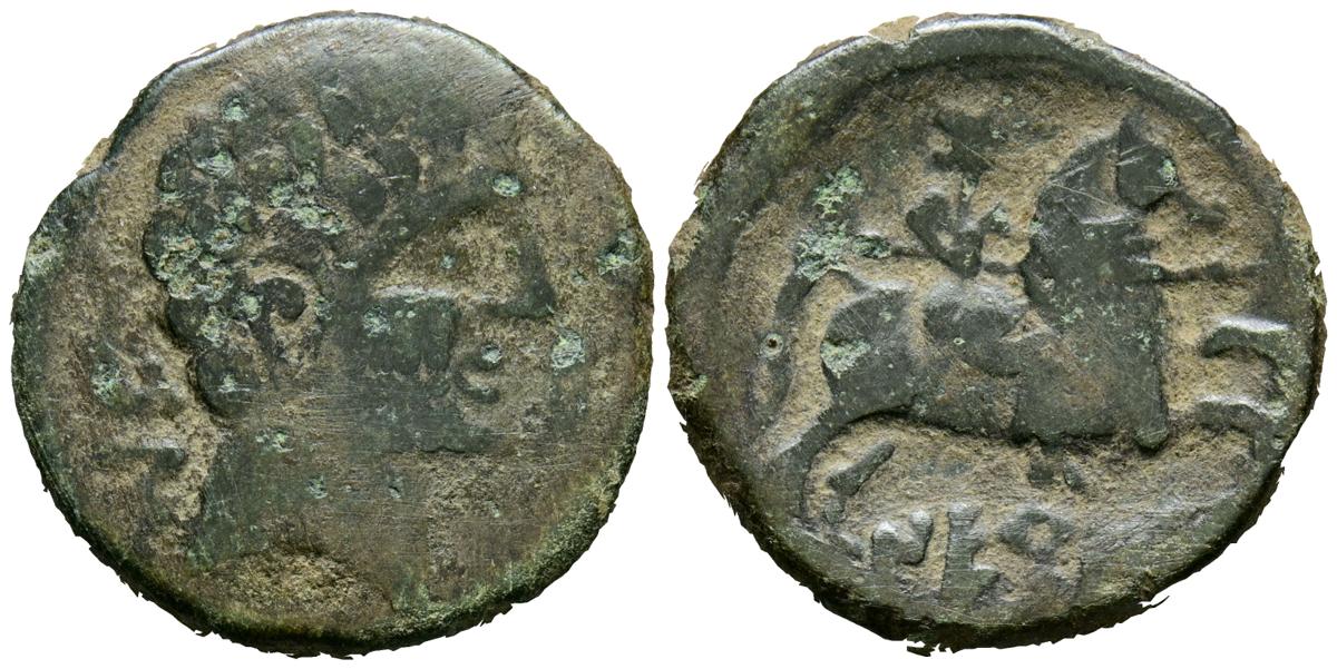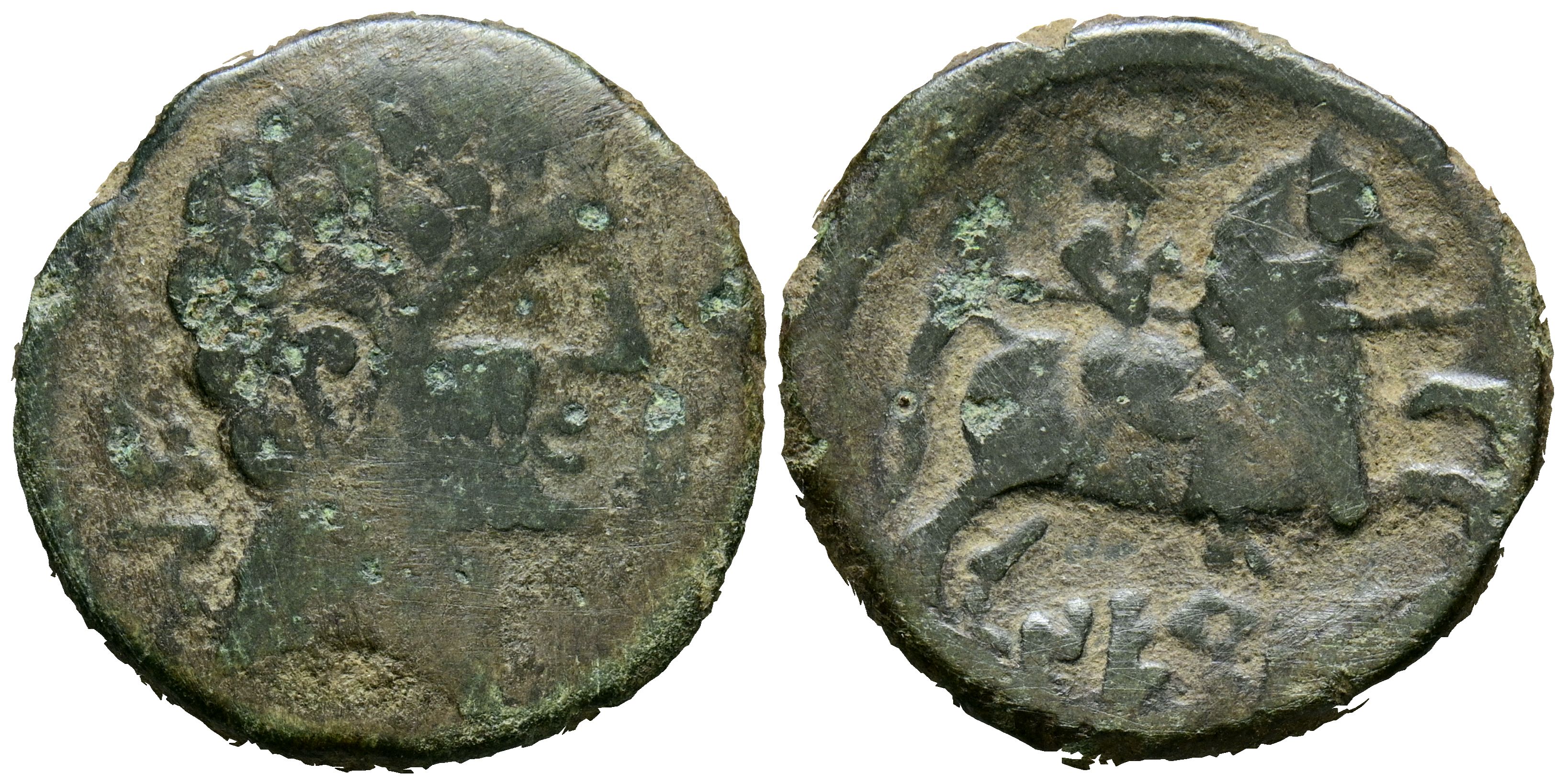 NERTOBIS (Calatorao, Zaragoza). As. (Ae. 7,81g/23mm). 120-20 a.C. (FAB-1771). Anv: Cabeza masculina a derecha entre dos delfines, detrás letra ibérica N. Rev: Jinete con lanza a derecha, debajo leyenda ibérica: NERToBiS. BC+.