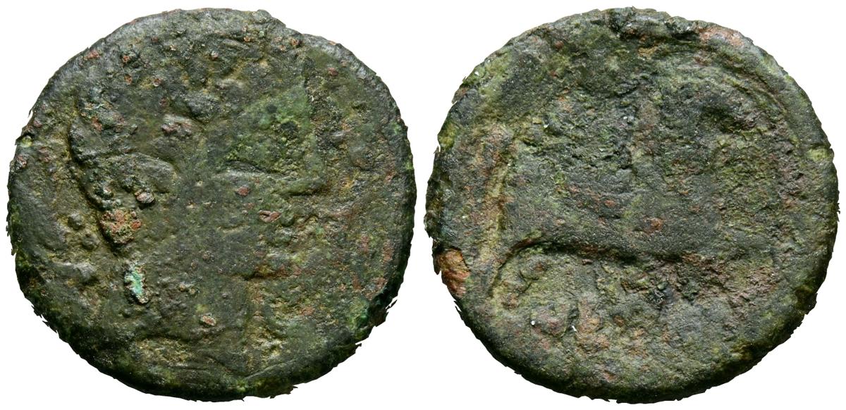 NERTOBIS (Calatorao, Zaragoza). As. (Ae. 8,84g/23mm). 120-20 a.C. (FAB-1771). Anv: Cabeza masculina a derecha entre dos delfines, detrás letra ibérica N. Rev: Jinete con lanza a derecha, debajo leyenda ibérica: NERToBiS. BC+/BC.
