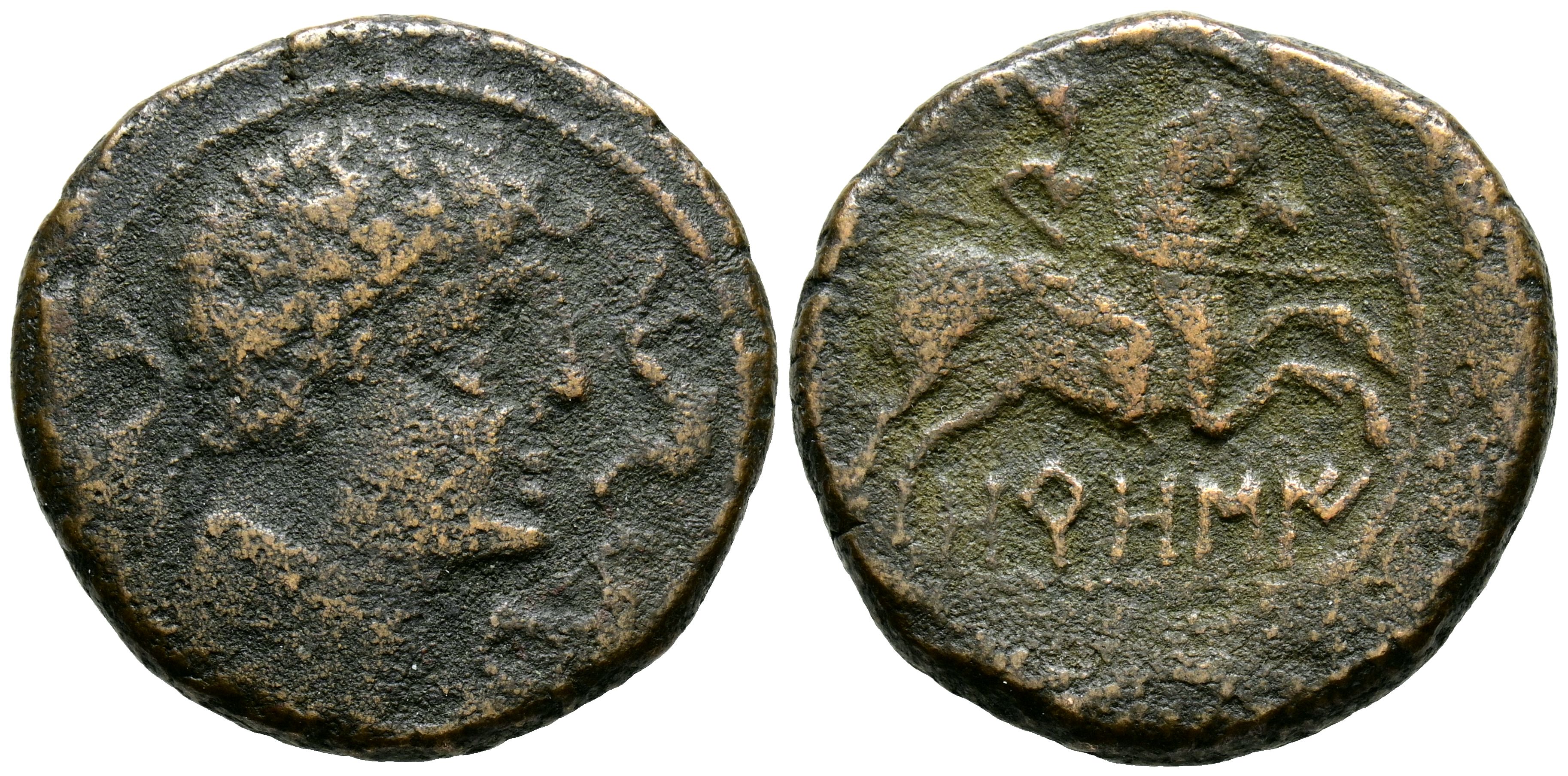 OROSIS (Ores, Zaragoza). As. (Ae. 10,04g/26mm). 120-20 a.C. (FAB-1908). Anv: Cabeza barbada masculina a derecha, entre tres delfines, con adornos en el cuello. Rev: Jinete con lanza a derecha, debajo leyenda ibérica: OROSIS. MBC-.