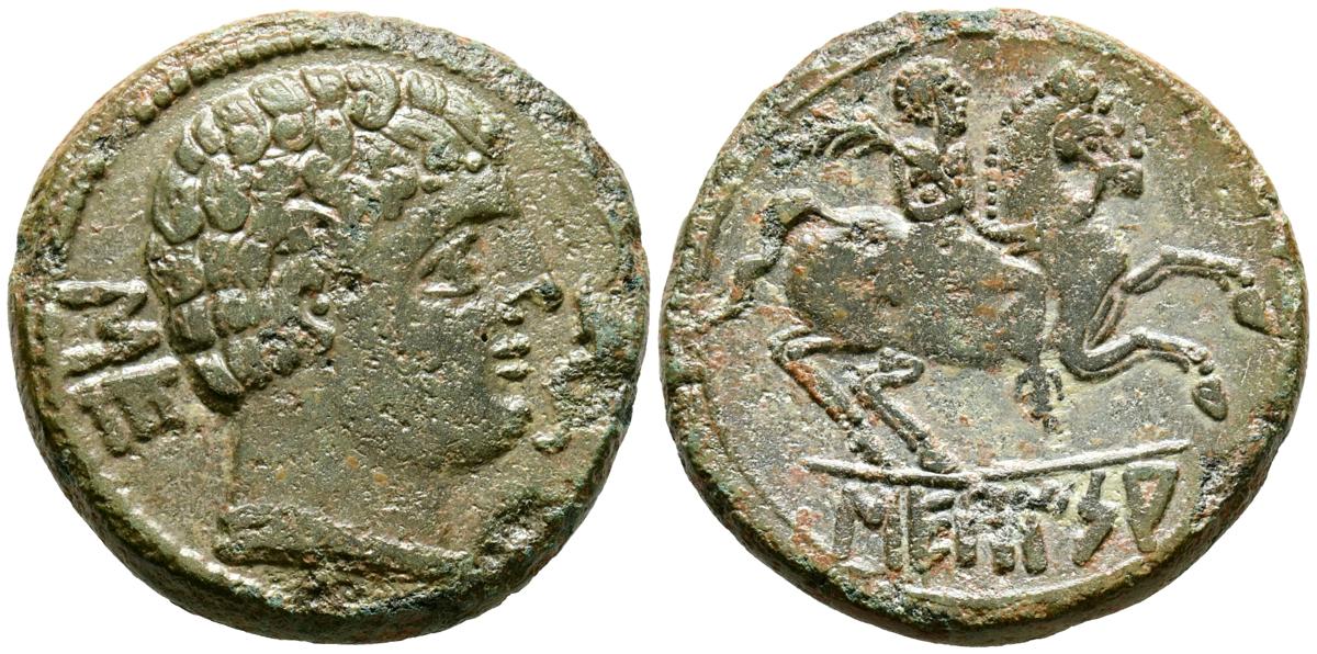 SECAISA (Segeda, Zaragoza). As. (Ae. 16,77g/29mm). 120-20 BC (FAB-2121). Anv: Cabeza masculina a derecha, detrás letras ibéricas: SE, delante delfín. Rev: Jintete con palma a derecha, debajo leyenda ibérica: SECaISA. MBC+.
