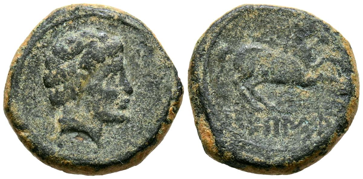 SECAISA (Segeda, Zaragoza). Semis. (Ae. 5,38g/19mm). 120-20 a.C. (FAB-2146). Anv: Cabeza masculina a derecha. Rev: Caballo a derecha, debajo leyenda ibérica bajo lÃnea: SECaISA. MBC-.