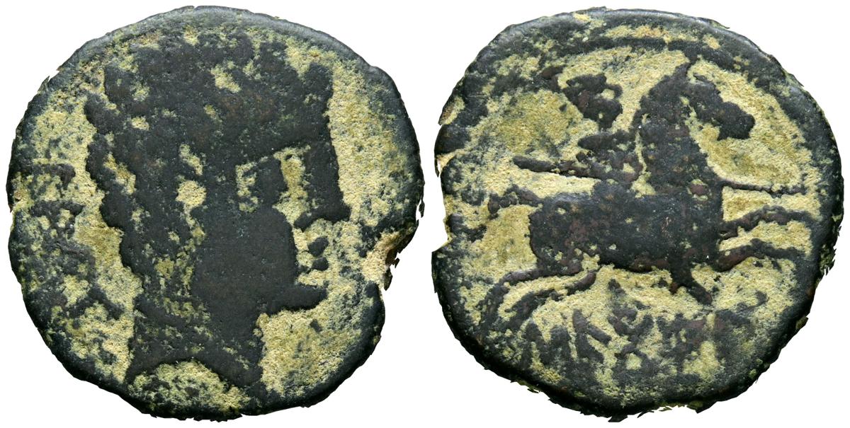 SECOTIAS (Sigüenza, Guadalajara). As. (Ae. 10,87g/25mm). 120-20 a.C. (FAB-2153). Anv: Cabeza masculina a derecha, delante delfín, detrás leyenda ibérica: LACaS. Rev: Jinete con lanza a derecha, debajo leyenda ibérica: SECoTiAS. BC+.