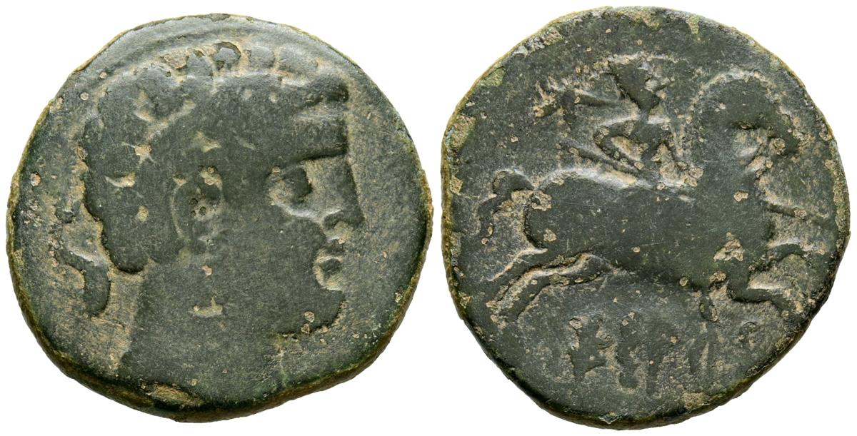 SESARS (Zona de Aragón). As. (Ae. 8,08g/25mm). 120-20 a.C. (FAB-2199). Anv: Cabeza masculina barbada a derecha, detrás delfÃn. Rev: Jinete con lanza a derecha, encima estrella, debajo leyenda ibérica: SESARS. MBC-.
