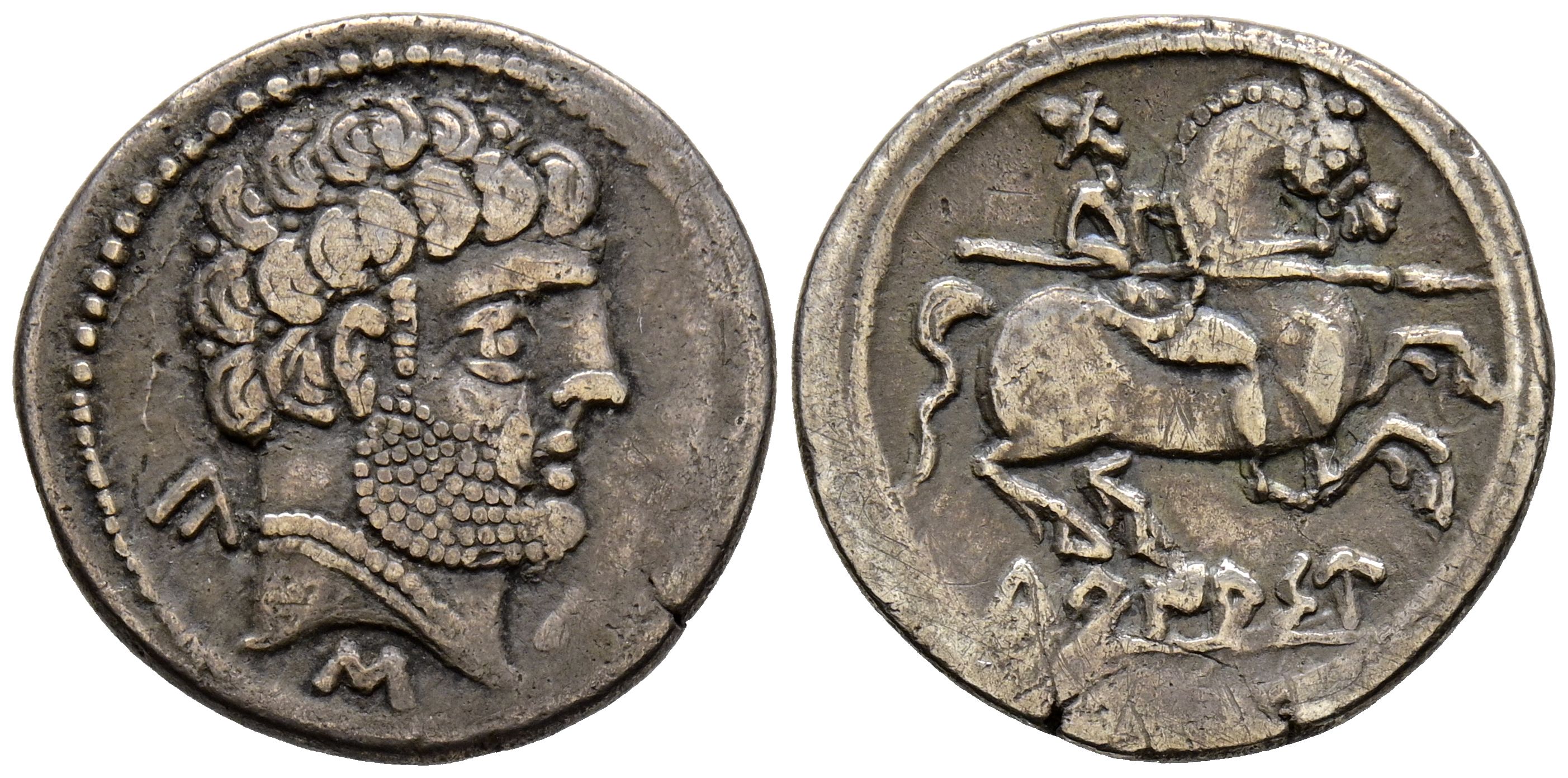 TURIASO (Tarazona, Zaragoza). Denario. (Ar. 3,41g/19mm). 120-20 a.C. (FAB-2412). Anv: Cabeza masculina barbada a derecha, detrás letra: CA, debajo: S y delante: Du. Rev: Jinete con lanza a derecha, debajo leyenda ibérica sobre lÃnea: TuRIASU. MBC.