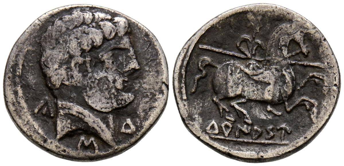TURIASO (Tarazona, Zaragoza). Denario. (Ar. 3,40g/18mm). 120-20 a.C. (FAB-2412). Anv: Cabeza masculina barbada a derecha, detrás letra: CA, debajo: S y delante: Du. Rev: Jinete con lanza a derecha, debajo leyenda ibérica sobre lÃnea: TuRIASU. BC+.
