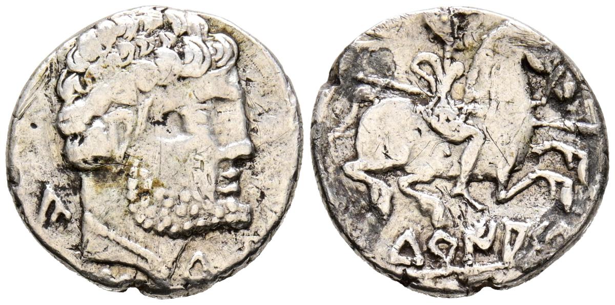 TURIASO (Tarazona, Zaragoza). Denario. (Ar. 3,30g/18mm). 120-20 a.C. (FAB-2412). Anv: Cabeza masculina barbada a derecha, detrás letra: CA, debajo: S y delante: Du. Rev: Jinete con lanza a derecha, debajo leyenda ibérica sobre lÃnea: TuRIASU. BC+.