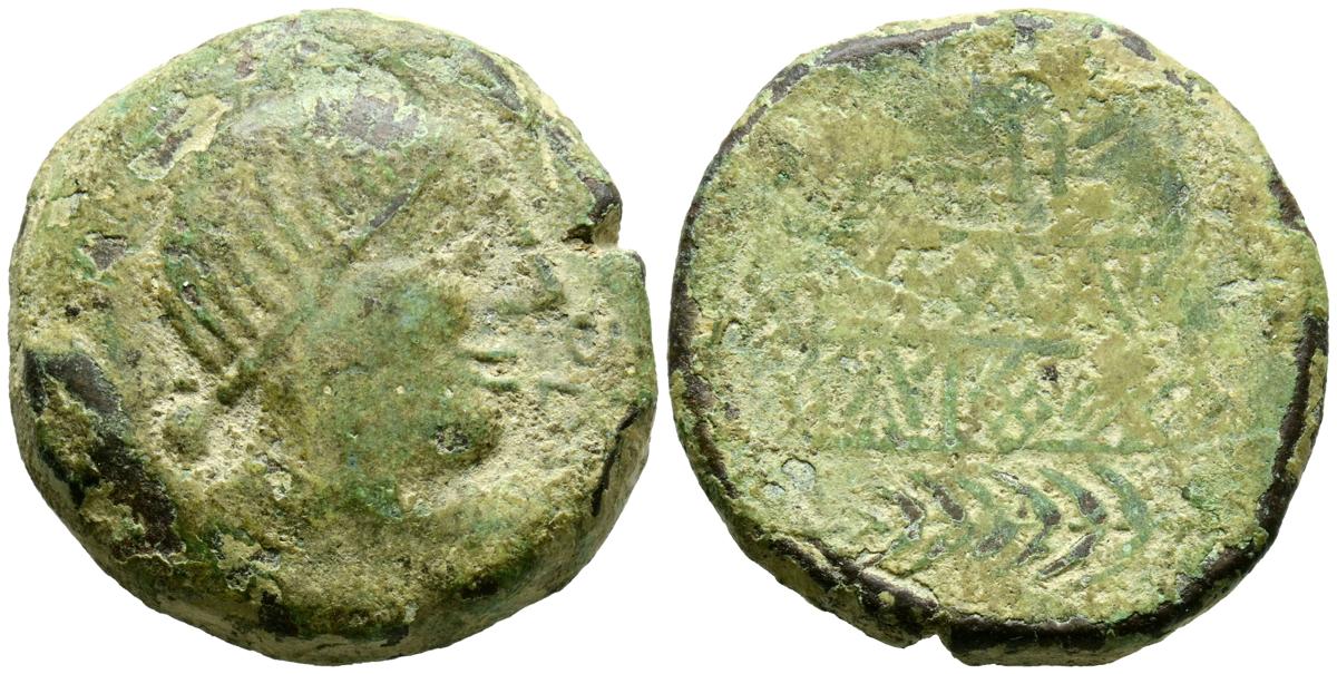 OBULCO (Porcuna, Jaén). As. (Ae. 19,40g/28mm). 220-20 a.C. (FAB-1791). Anv: Cabeza femenina a derecha, delante leyenda: OBVLCO. Rev: Espiga a derecha, debajo espiga a izquierda, entre ellos leyenda: ISCeRATeN/UIUBoLAI, sobre la espiga, letra ibera: Ta. MBC-/BC+.