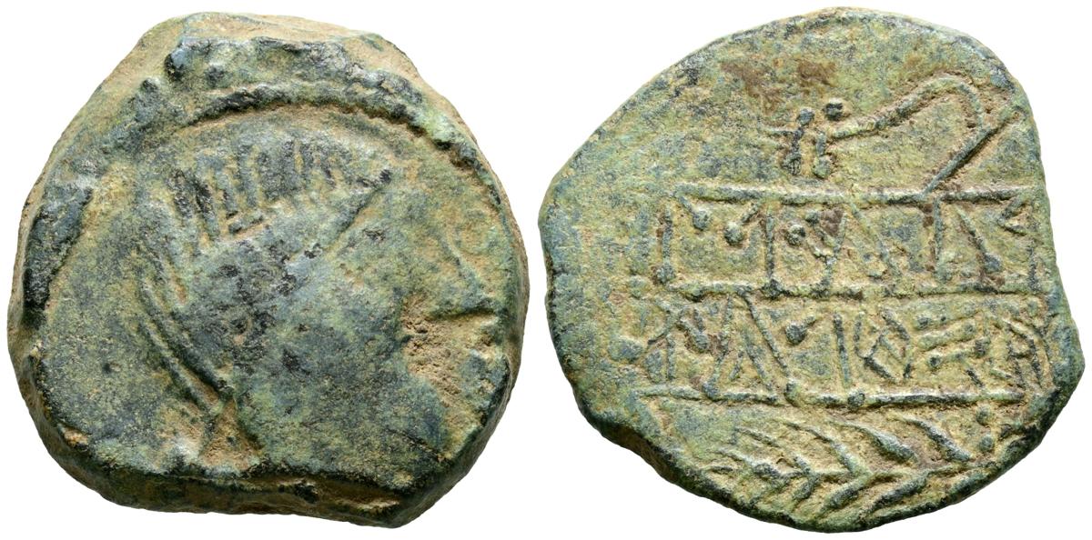 OBULCO (Porcuna, Jaén). As. (Ae. 14,42g/28mm). 220-20 a.C. (FAB-1791). Anv: Cabeza femenina a derecha, delante leyenda: OBVLCO. Rev: Espiga a derecha, debajo espiga a izquierda, entre ellos leyenda: ISCeRATeN/UIUBoLAI, sobre la espiga, letra ibera: Ta. MBC-.