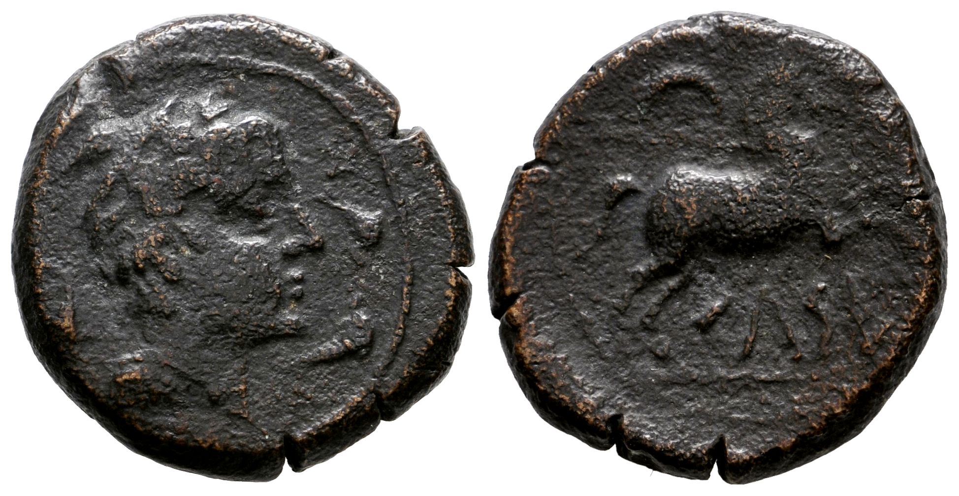 CELSA-KELSE. Semis. 120-50 a.C. Velilla de Ebro (Zaragoza) A/ Cabeza masculina a derecha, rodeada de tres delfines. R/ Caballo a derecha, encima creciente, sobre exergo KeLSE. FAB-787. Ae. 8,16g. MBC-. Escasa.