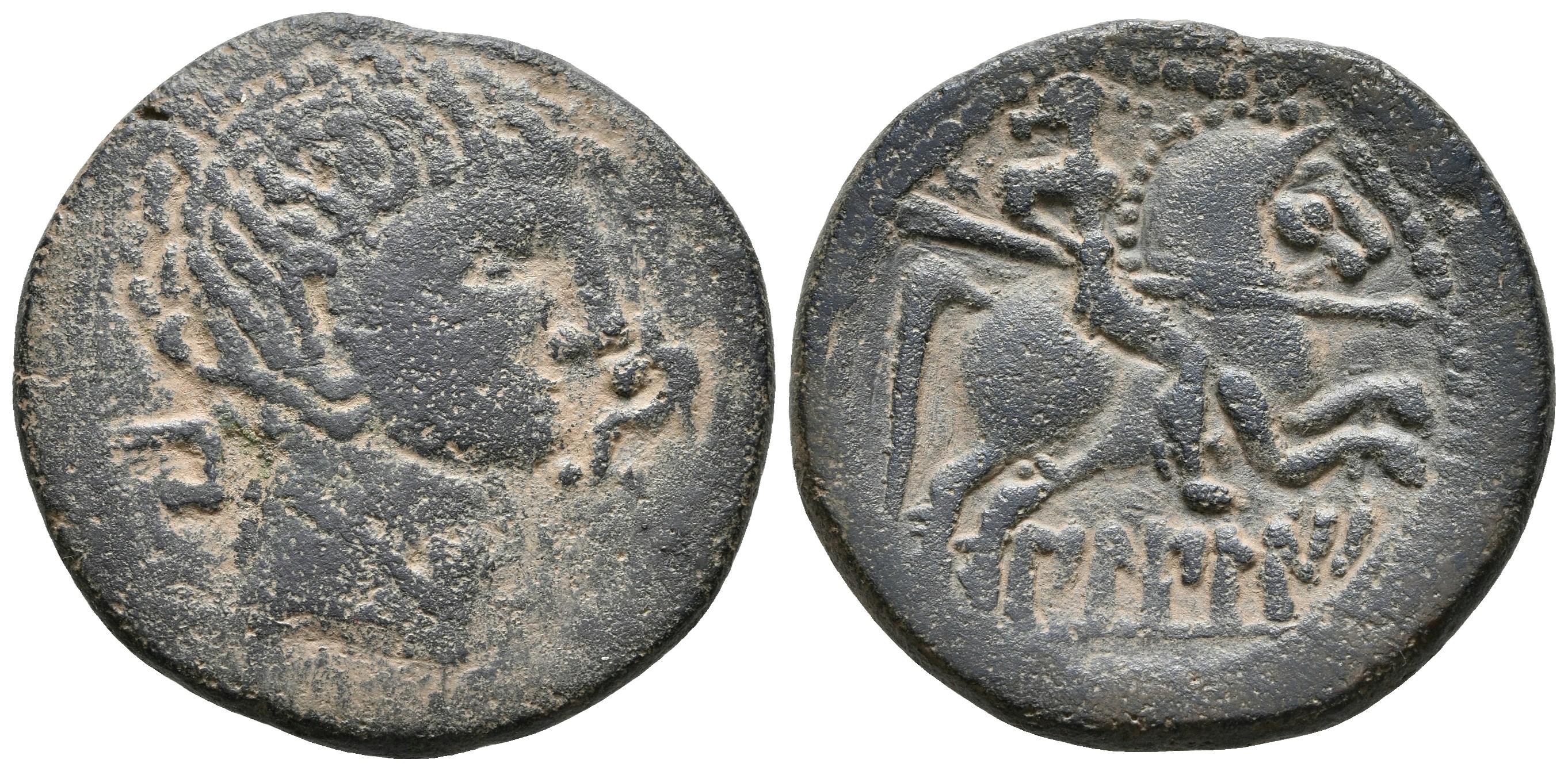 BILBILIS. As. 120-30 a.C. Calatayud (Zaragoza). A/ Cabeza masculina a derecha, delante delfÃn, detrás letra ibérica Bi. R/ Jinete con lanza a derecha, debajo (BiLBiLIS). FAB-258. Ae. 11,98g. BC+/MBC+.