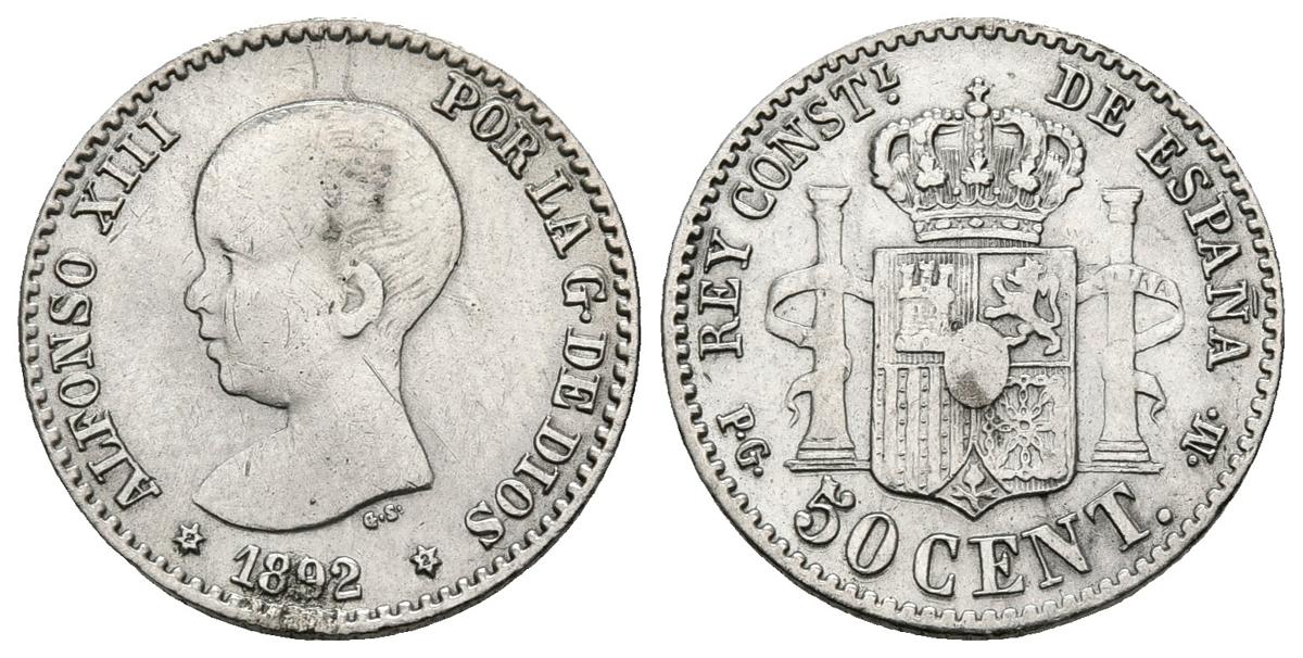 ALFONSO XIII. 50 Céntimos. 1892 *2-2. Madrid PGM. Cal-56. Ar. 2,48g. Restos de soldadura. MBC. Escasa.