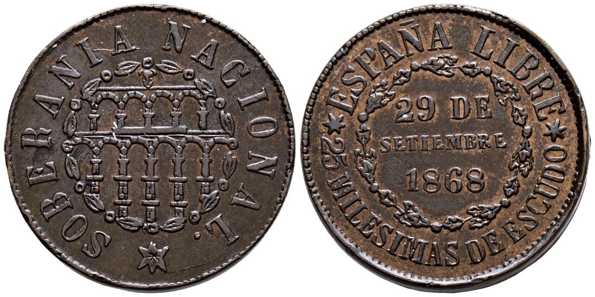GOBIERNO PROVISIONAL (1868-1871). 25 Milésimas de Escudo. (Ae. 6,46g/25mm). 1868. Segovia. (Cal-2019-10). EBC. Algún ligero golpecito en listel. Escasa.