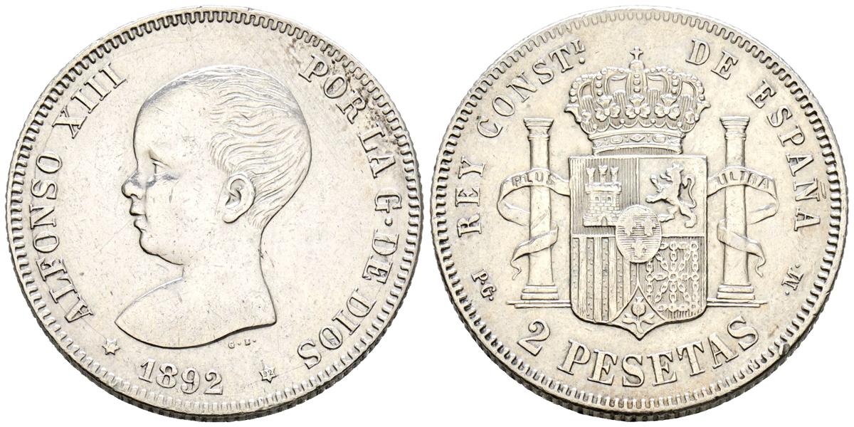 ALFONSO XIII (1885-1931). 2 Pesetas. (Ar. 9,97g/27mm). 1892 *18-92. Madrid PGM. (Cal-2019-85). Primera estrella muy floja. MBC+. Limpiada. Muy escasa.