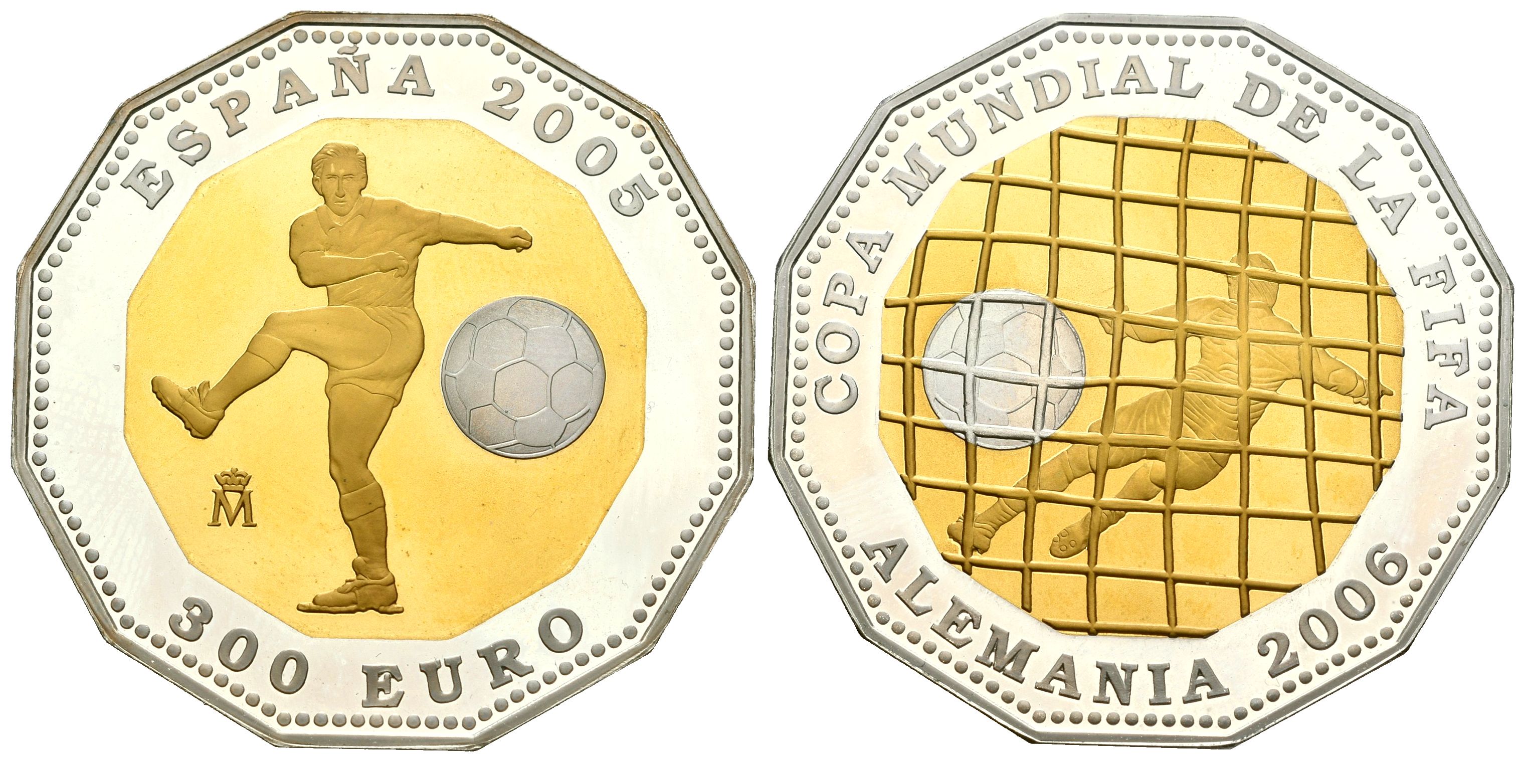 JUAN CARLOS I (1975-2014). 300 Euros. (Au-Ar. 28,91g/40mm). 2005. FNMT. Mundial de Fútbol Alemania 2006. Moneda bimetálica: centro en oro de 0.999 milésimas: 17,26g y anillo en plata 11,54g en plata de 0.925 milésimas. PROOF.