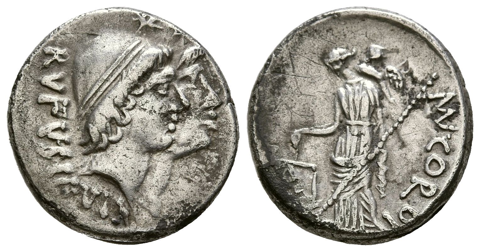 GENS CORDIA. Denario. (Ar. 3,87g/17mm). 46 a.C. Roma. (Crawford 463/1b; FFC 604). Anv: Cabeza diademadas de los Dioscuros a derecha, encima estrellas, detrás leyenda: RVFVS III VIR. Rev: Venus Verticordia estante a izquierda portando escalas y cetro, a su espalda cupido, detrás leyenda: MN CORDI. MBC.
