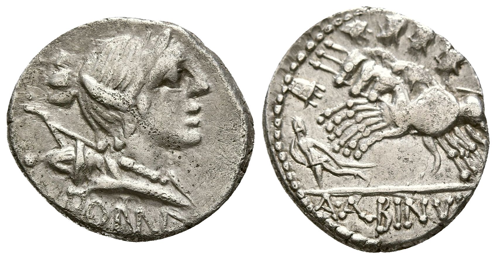 GENS POSTUMIA. Denario. (Ar. 3,88g/18mm). 96 a.C. Taller auxiliar de Roma. (Crawford 355/9; FFC 1065). Anv: Busto de Diana a derecha con arco y carcaj, debajo leyenda: ROMA. Rev: Tres jinetes a izquierda, delante guerrero caÃdo, en exergo: A ALBINVS SF. MBC.