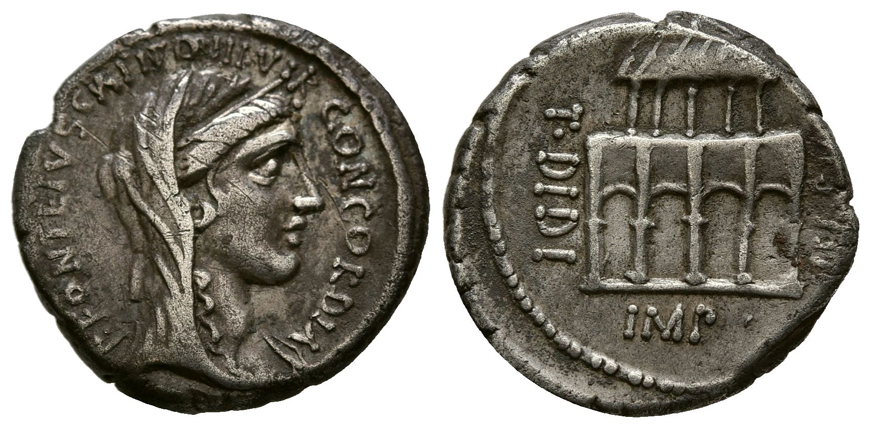 GENS DIDIA. Denario. (Ar. 3,86g/18mm). 55 a.C. Roma. (Crawford 429/2a; FFC 677). Anv: Cabeza diademada y velada de Concordia a derecha, alrededor leyenda: P FONTEIVS CAPITO III VIR CONCORDIA. Rev: Fachada de la Villa Pública con dos pisos de columnas y arcos, alrededor leyenda: T DIDI IMP VIL PVB. MBC+. Escaso ejemplar.