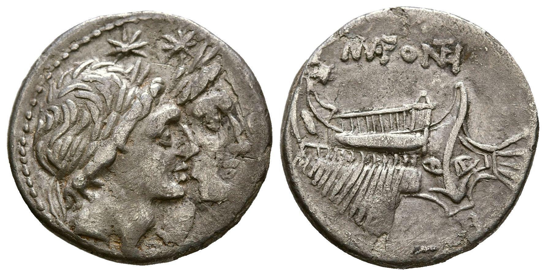 GENS FONTEIA. Denario. (Ar. 3,76g/19mm). 114-113 a.C. Roma. (Crawford 307/1b; FFC 714). Anv: Cabezas laureadas de los Dioscuros a derecha, encima estrellas, delante estrella. Rev: Galera a derecha con timonel, debajo B, encima leyenda: M FONTEI. MBC.