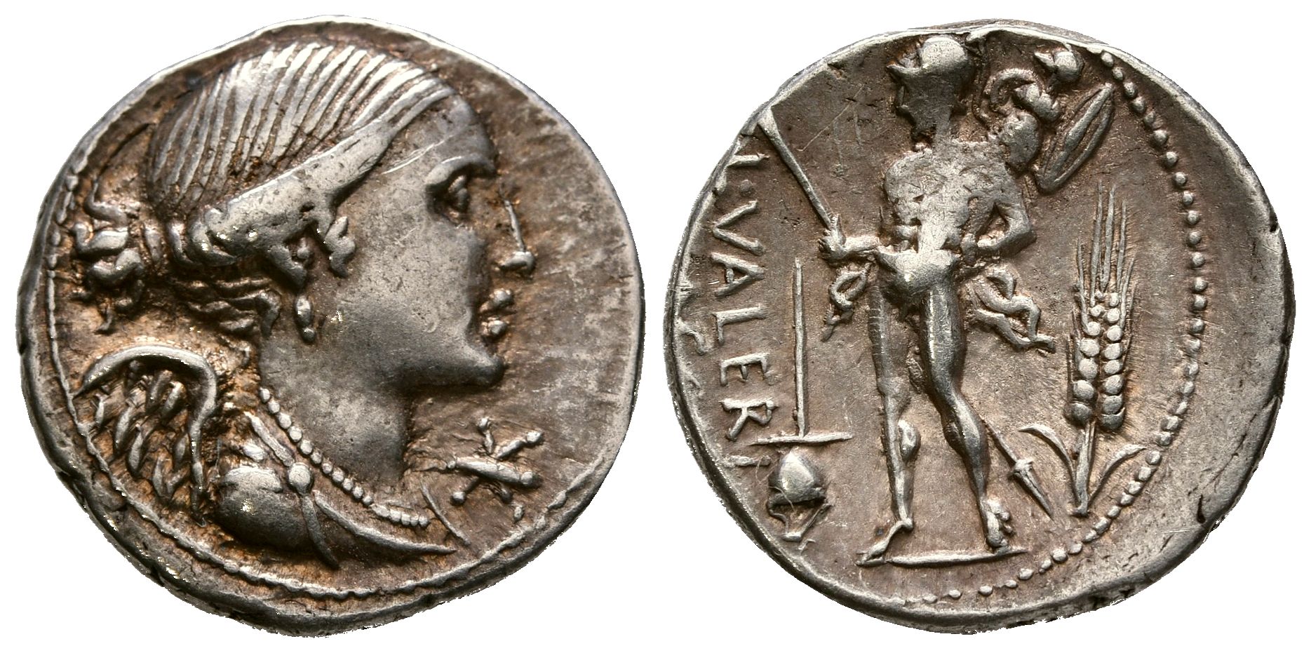 GENS VALERIA. Denario. (Ar. 3,92g/20mm). 108-107 a.C. Sur de Italia. (Crawford 306/1; FFC 1165). Anv: Busto alado de la Victoria a derecha, delante estrella. Rev: Marte avanzando a izquierda portando trofeo y labza a izquierda, delante gorro flamen y detrás espiga, en campo leyenda: L VALERI/FLACCI. MBC.