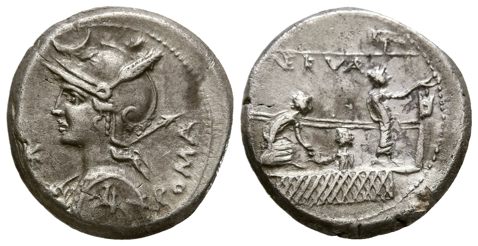 GENS LICINIA. Denario. (Ar. 3,87g/17mm). 113-112 a.C. Ceca incierta. (Crawford 292/1; FFC 802). Anv: Busto de Roma a izquierda portando casco y coraza portando lanza y escudo, encima creciente, delante estrella, detrás leyenda: ROMA. Rev: Tres ciudadanos en el recinto de los comicios, uno de ellos introduciendo voto en urna, el otro dando su voto a el tercero, encima leyenda: NERVA. MBC+.