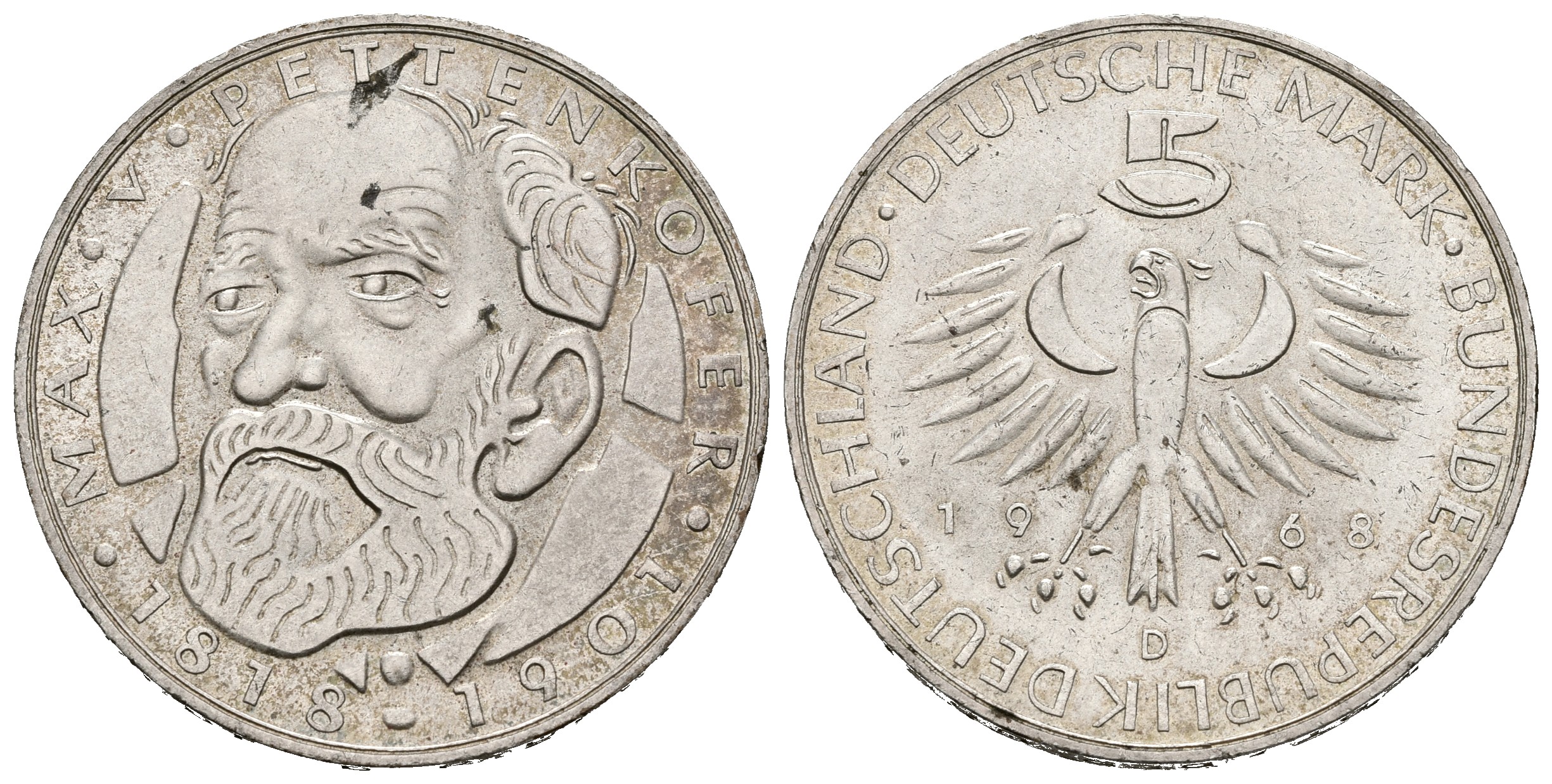 ALEMANIA. 5 Marcos. (CuNi. 11,18g/29mm). 1968. (KM#123.1). 150º aniversario del nacimiento de Max Von Pettenkofer. EBC.