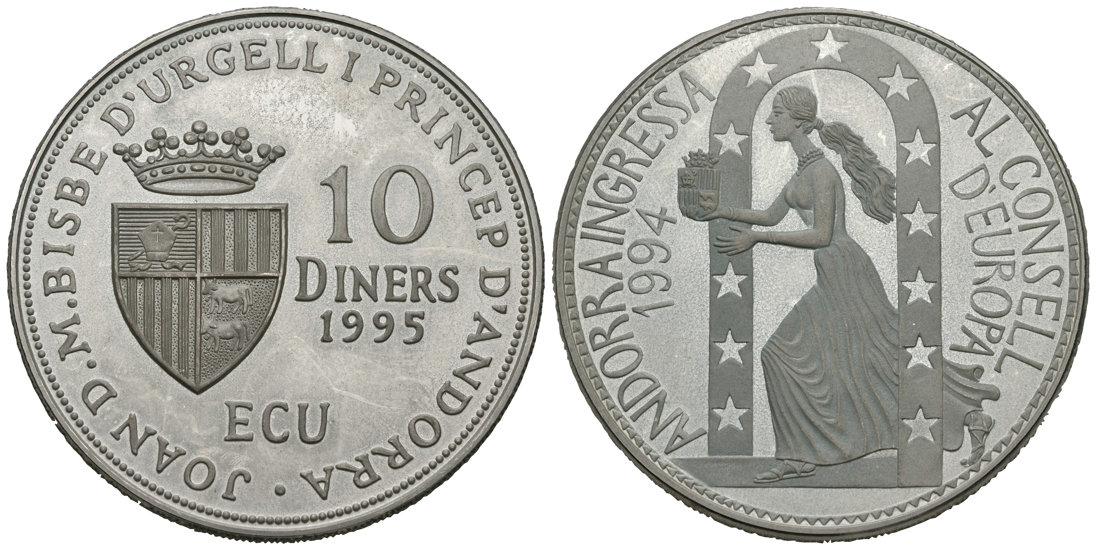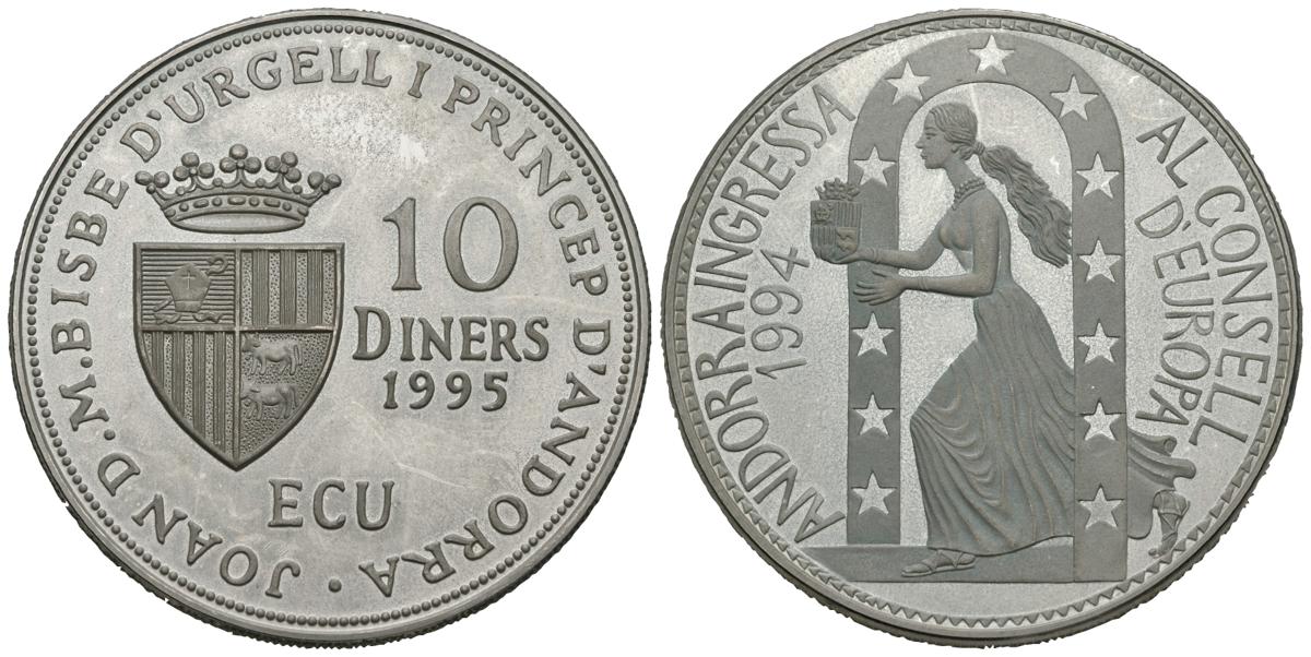 ANDORRA. 10 Diners-Ecu. Andorra Ingressa al Consell D´Europa. 1994. (Ar. 33,48g/38,6mm). Proof.