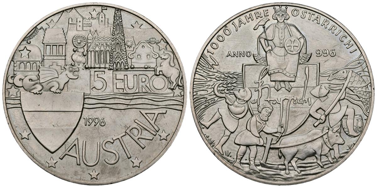 AUSTRIA. 5 Euro. 1000 Aniversario Fundación de Austria 996-1996. 1996. (CuNi. 22,53g/37,00mm). SC.