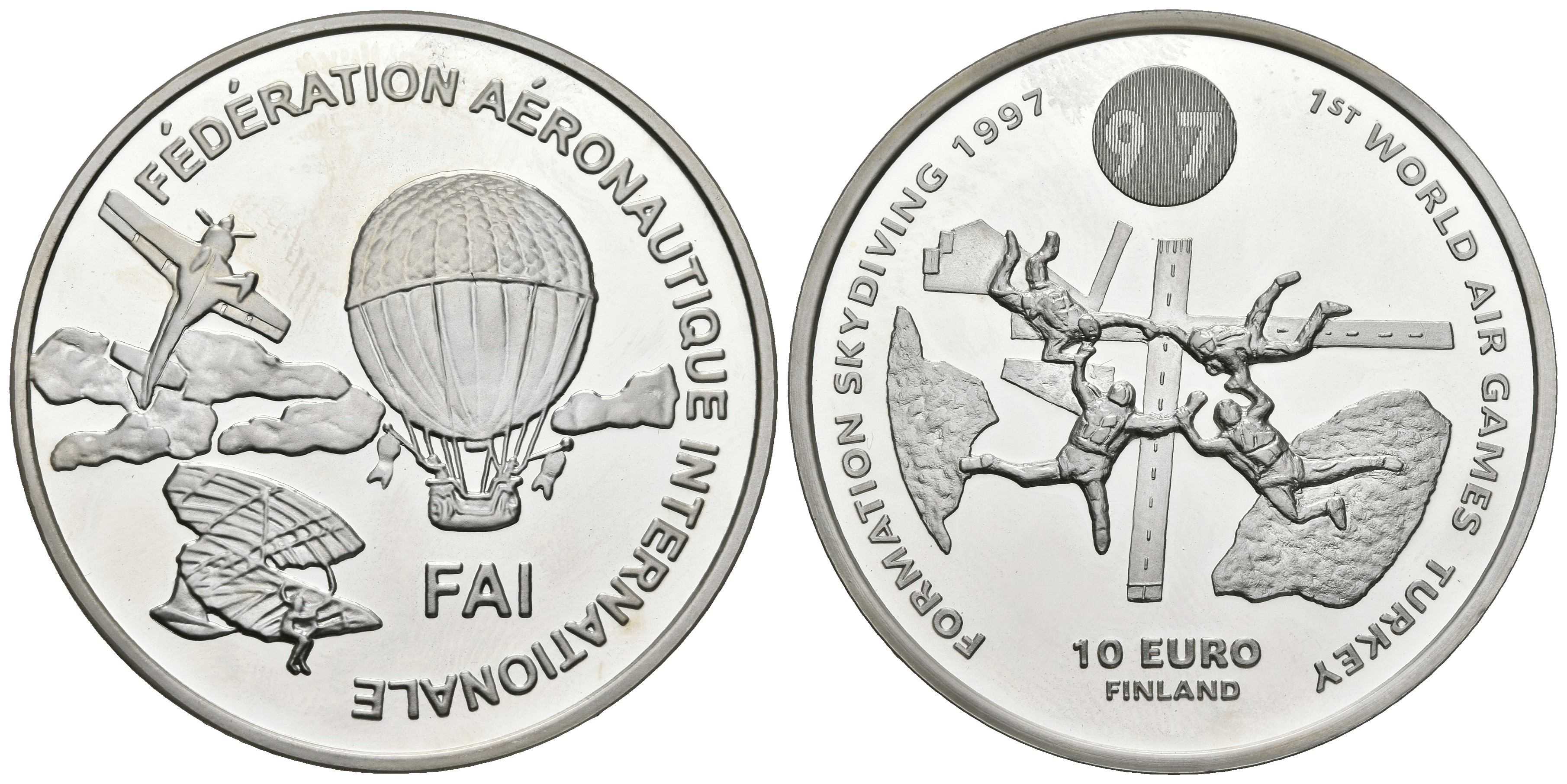 FINLANDIA. 10 Euro. 1st World Air Games Turkey.Formation Skydiving. 1997. (Ar. 27,11g/38,5mm). Proof.