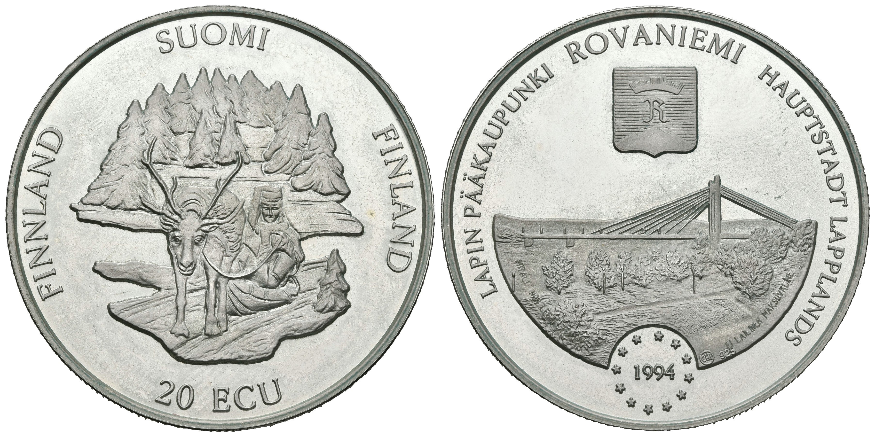 FINLANDIA. 20 Ecu. Rovaniemi. 1994. (Ar. 25,00g/38,5mm). Proof.