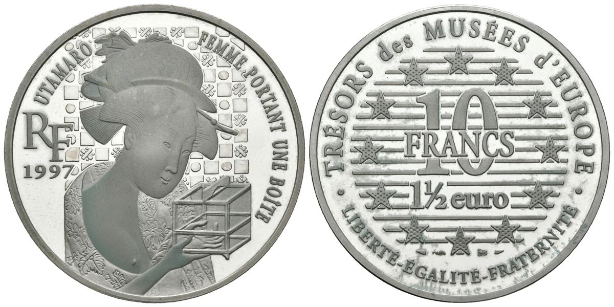 FRANCIA. 10 Francs. 1 1/2 Euro. Tesoros de los Museos de Europa. Utamaro. 1997. (Ar. 22,24g/37,00mm). Proof