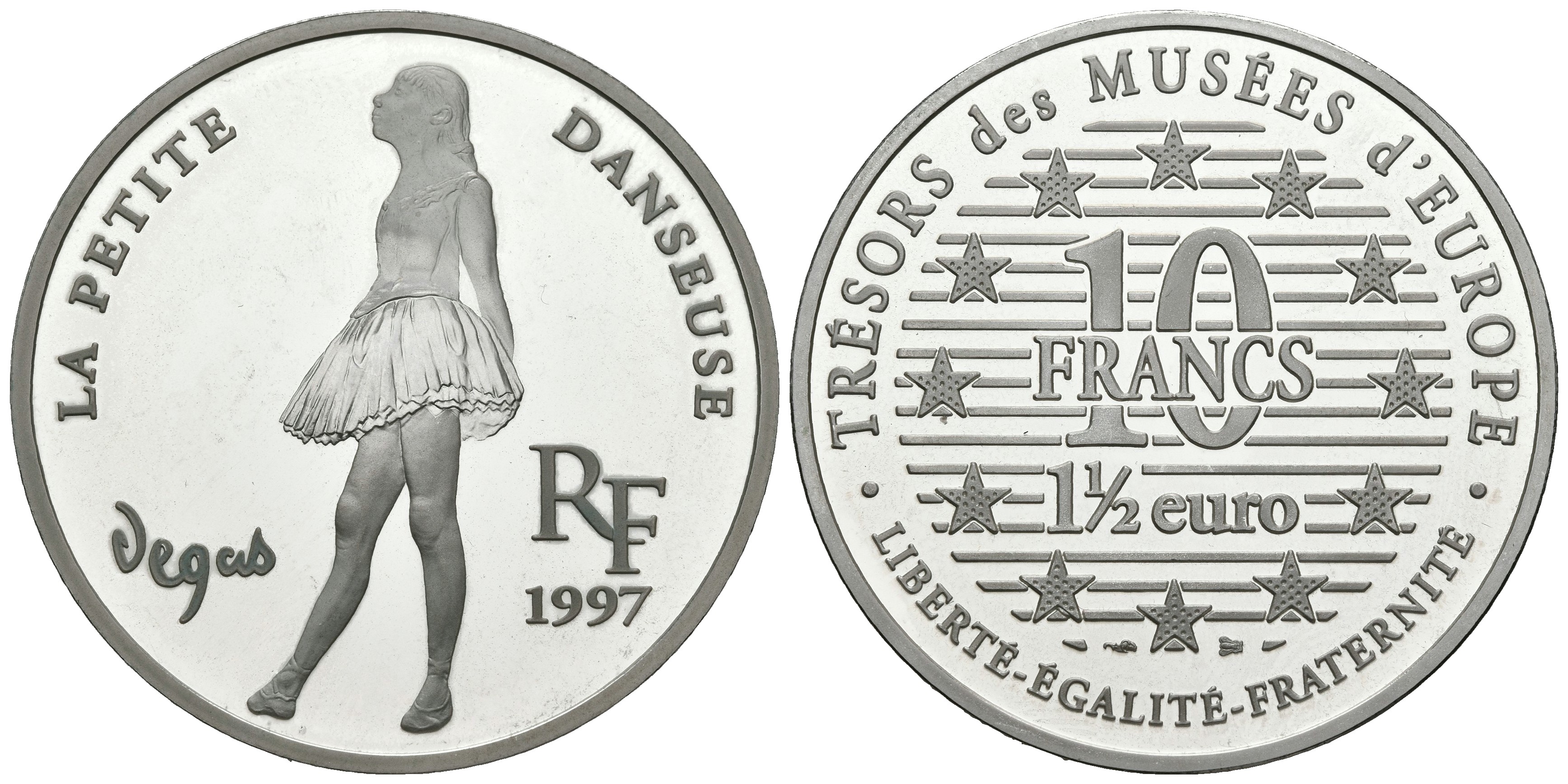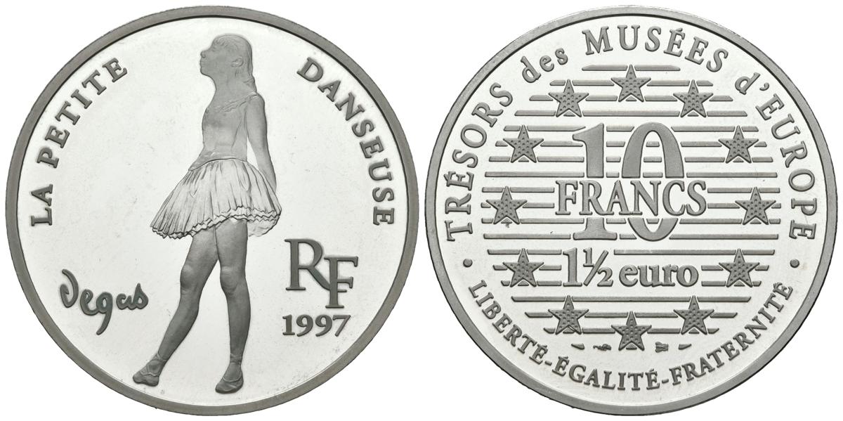 FRANCIA. 10 Francs. 1 1/2 Euro. Tesoros de los Museos de Europa. Degas. 1997. (Ar. 22,25g/37,00mm). Proof.