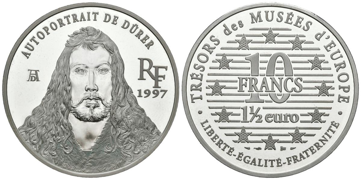 FRANCIA. 10 Francs. 1 1/2 Euro. Tesoros de los Museos de Europa. Durero. 1997. (Ar. 22,27g/37,00mm). Proof.