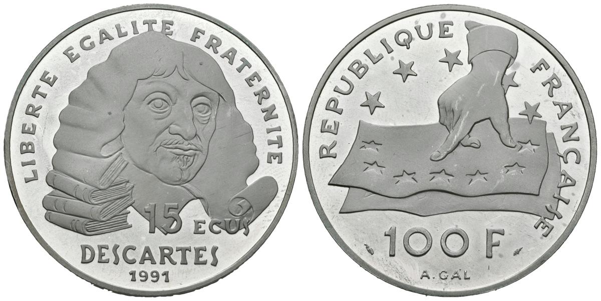 FRANCIA. 100 Francs. 15 Ecus. René Descartes. 1991. (Ar. 22,34g/37,00mm). Proof.