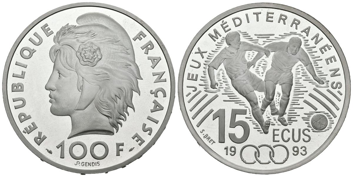 FRANCIA. 100 Francs. 15 Ecus. Jeux Mediterraneu. 1993. (Ar. 22,22g/37,00mm). Proof.