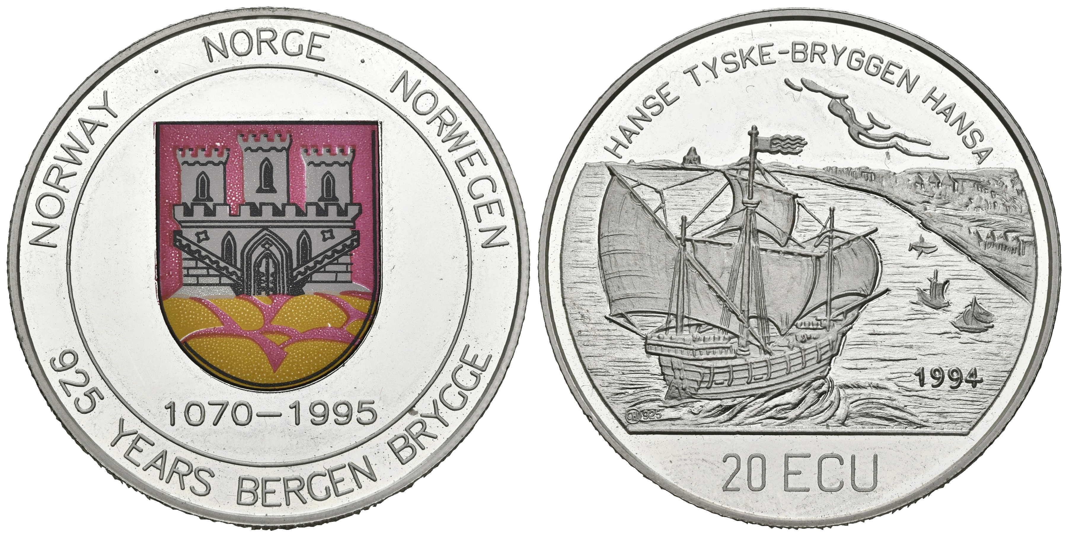 NORUEGA. 20 Ecu. 925 Aniversario Bergen Bryce 1995. (Ar. 24,99g/38,3mm). Proof.