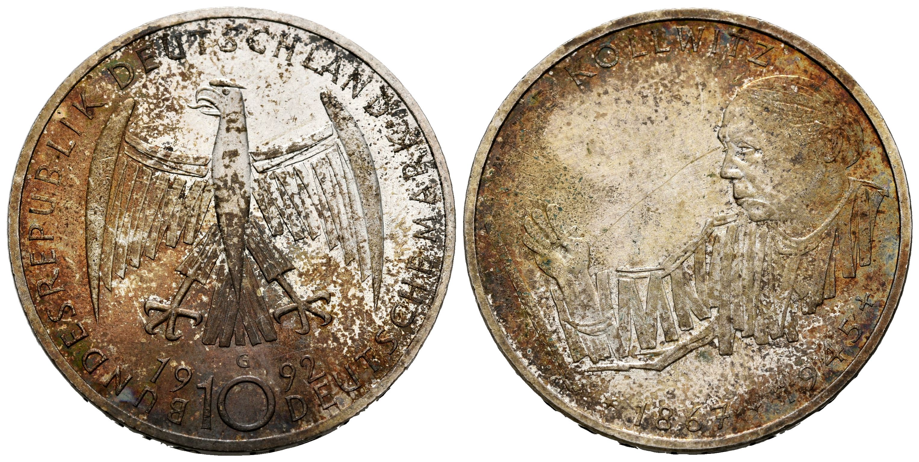 ALEMANIA. 10 Marcos (Ar. 15,48g/33mm). 1992. Karlsruhe G. 125 Aniversario del Nacimiento de Kathe Kollwitz. (Km#178). MBC+.
