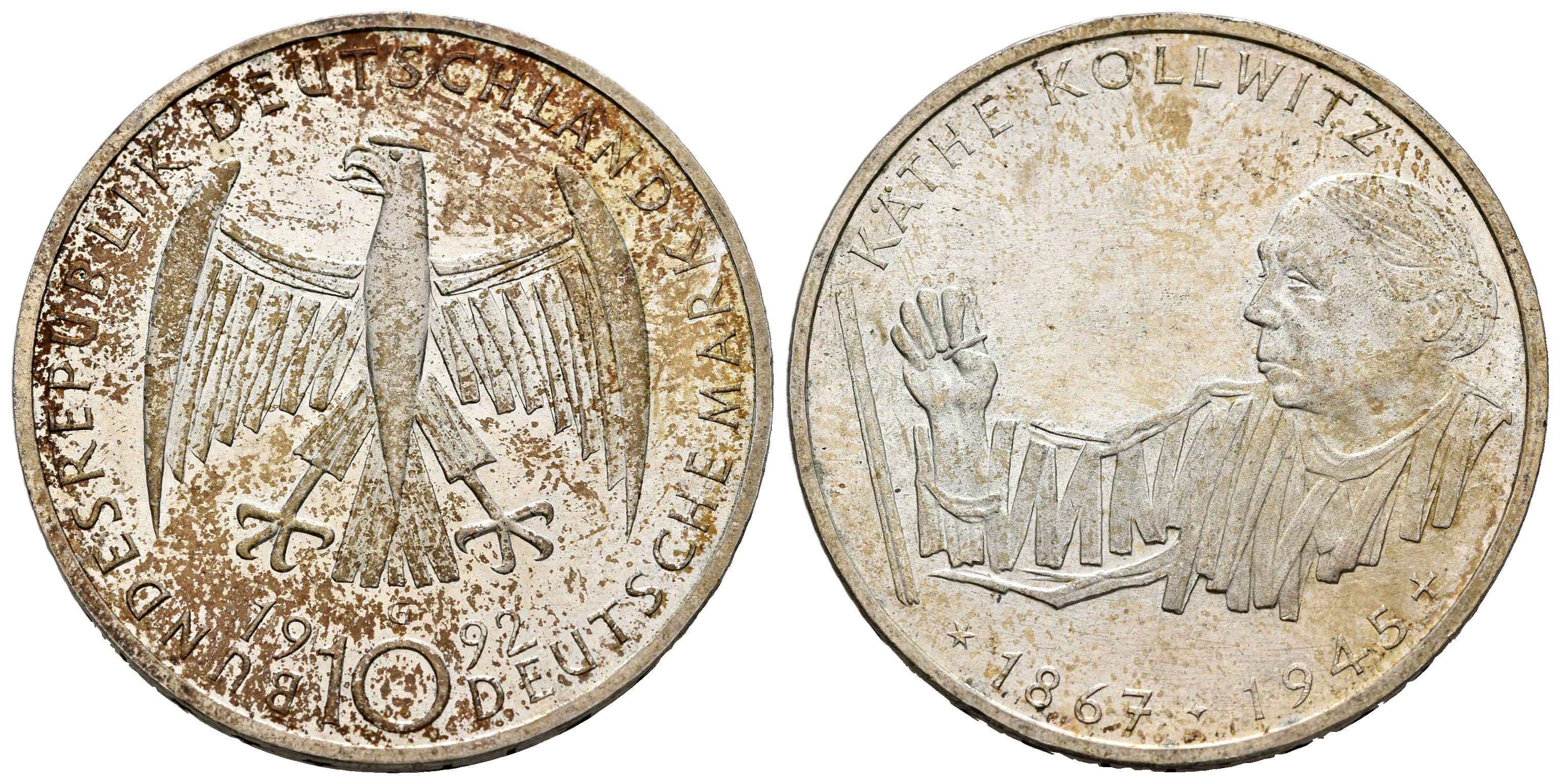 ALEMANIA. 10 Marcos (Ar. 15,45g/33mm). 1992. Karlsruhe G. 125 Aniversario del Nacimiento de Kathe Kollwitz. (Km#178). MBC+.