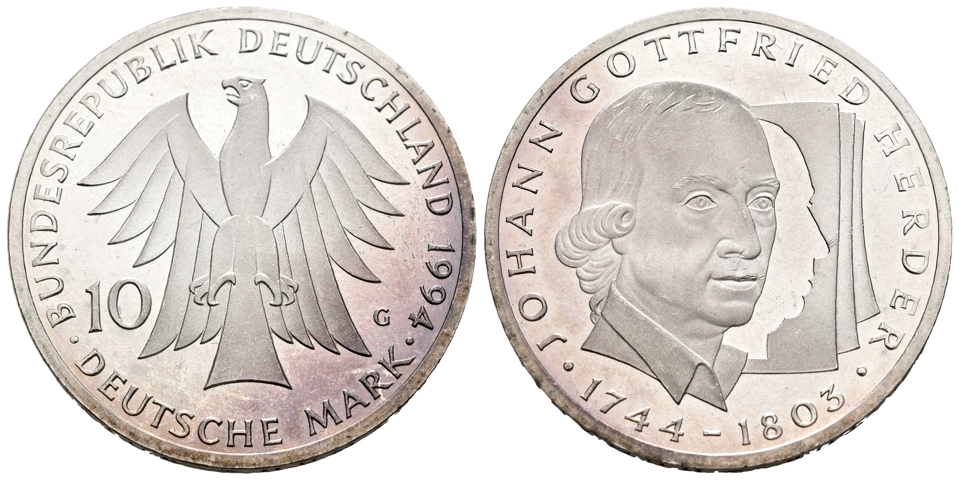 ALEMANIA. 10 Marcos (Ar. 15,55g/33mm). 1994. Karlsruhe G. 250 Aniversario del nacimiento de Johann Gottfried Herder. (Km#184). EBC+. Ligeras marquitas.