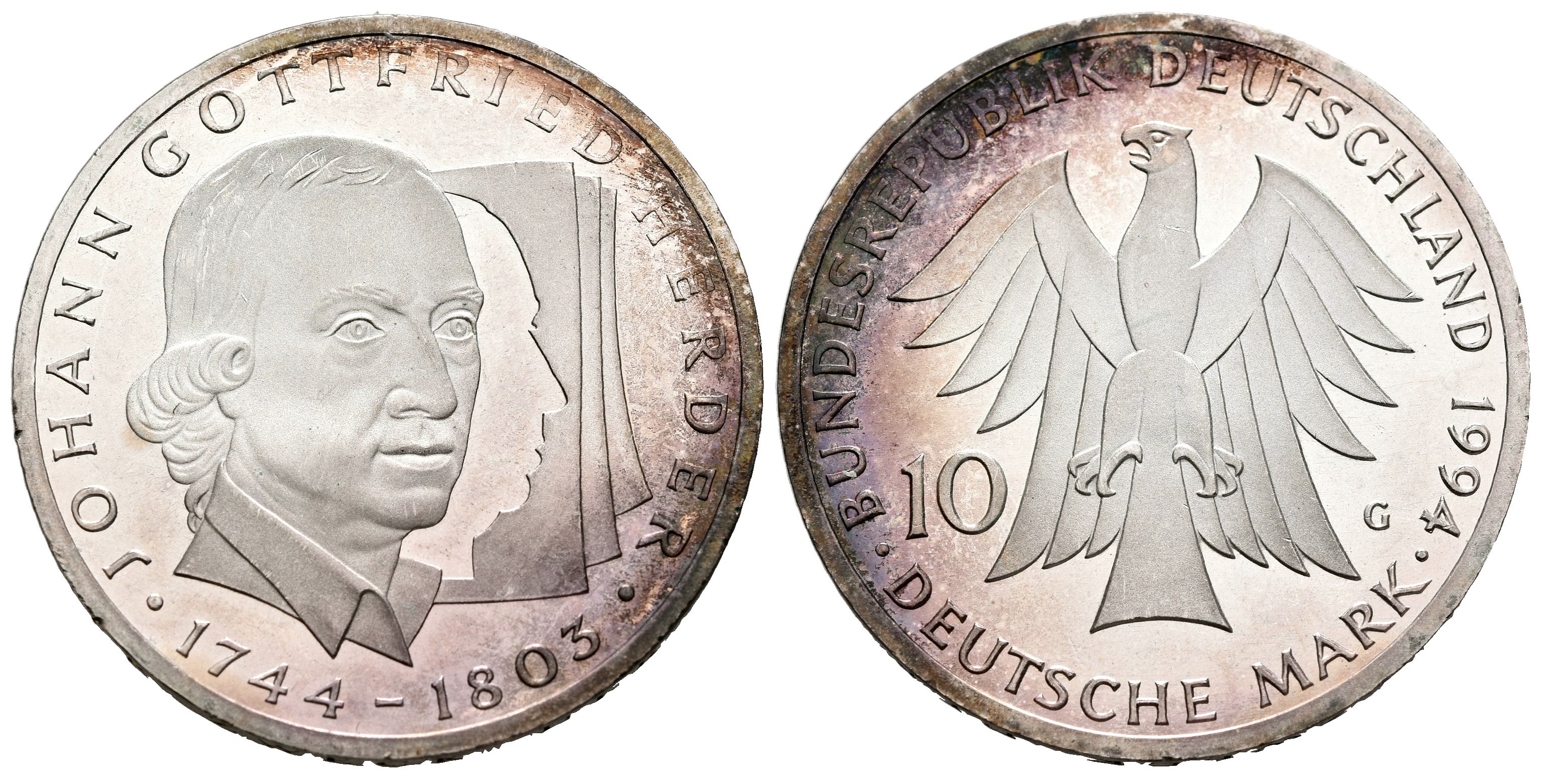 ALEMANIA. 10 Marcos (Ar. 15,49g/33mm). 1994. Karlsruhe G. 250 Aniversario del nacimiento de Johann Gottfried Herder. (Km#184). EBC+. Rayitas.