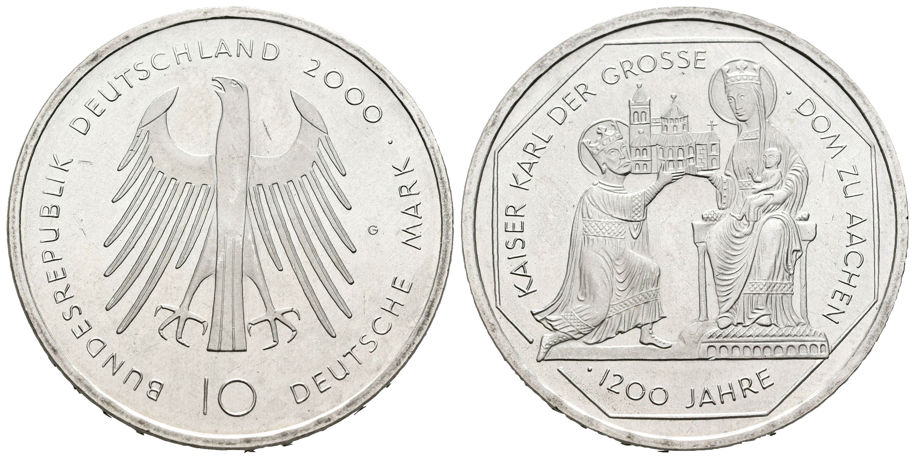 ALEMANIA. 10 Marcos (Ar. 15,47g/33mm). 2000. Karlsruhe G. 1200 Aniversario Catedral de Aachen. (Km#200). SC-. Ligeras marquitas.