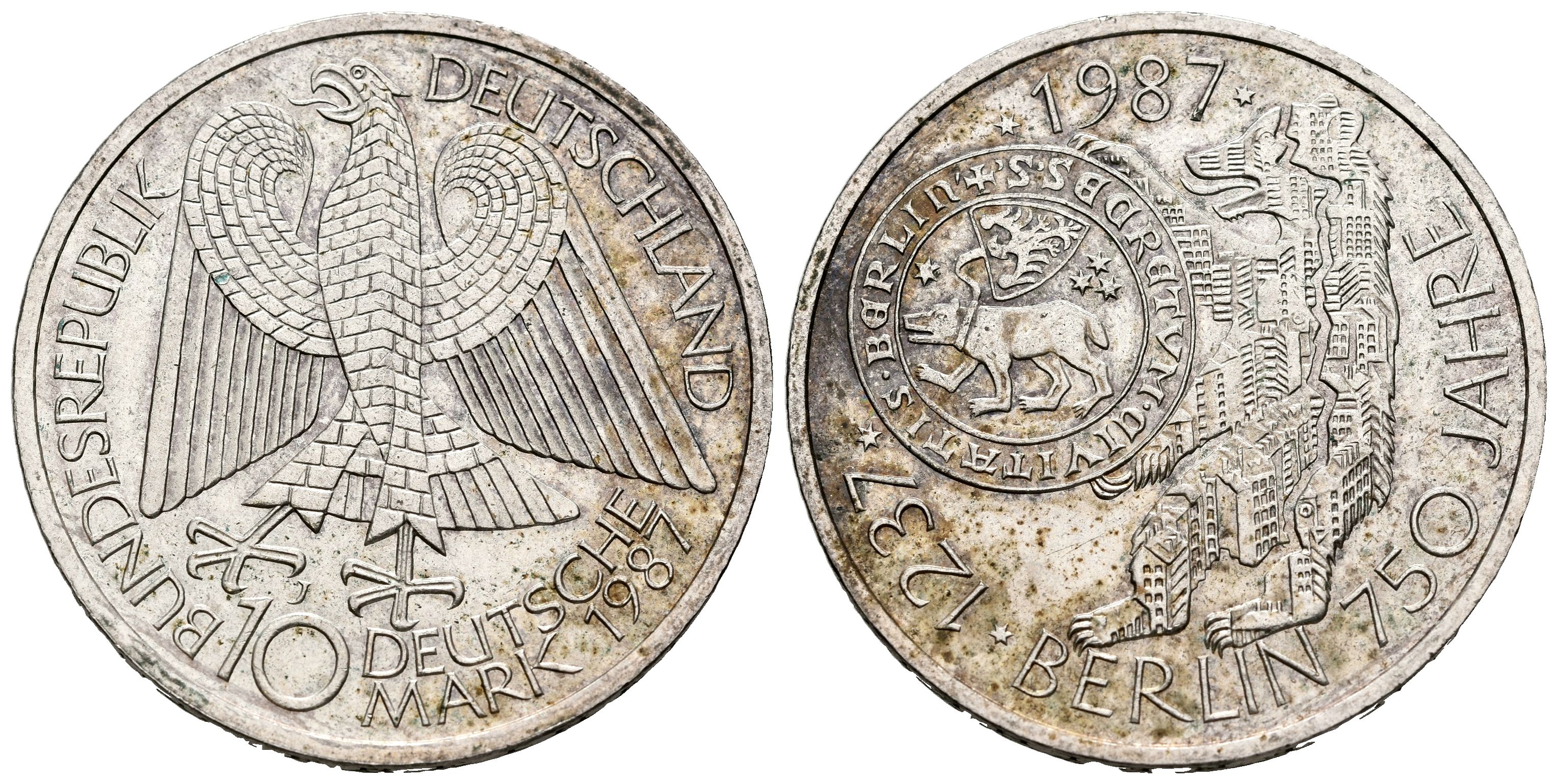 ALEMANIA. 10 Marcos (Ar. 15,57g/33mm). 1987. Hamburgo J. 750 Aniversario Fundación de BerlÃn. (Km#166). MBC+.